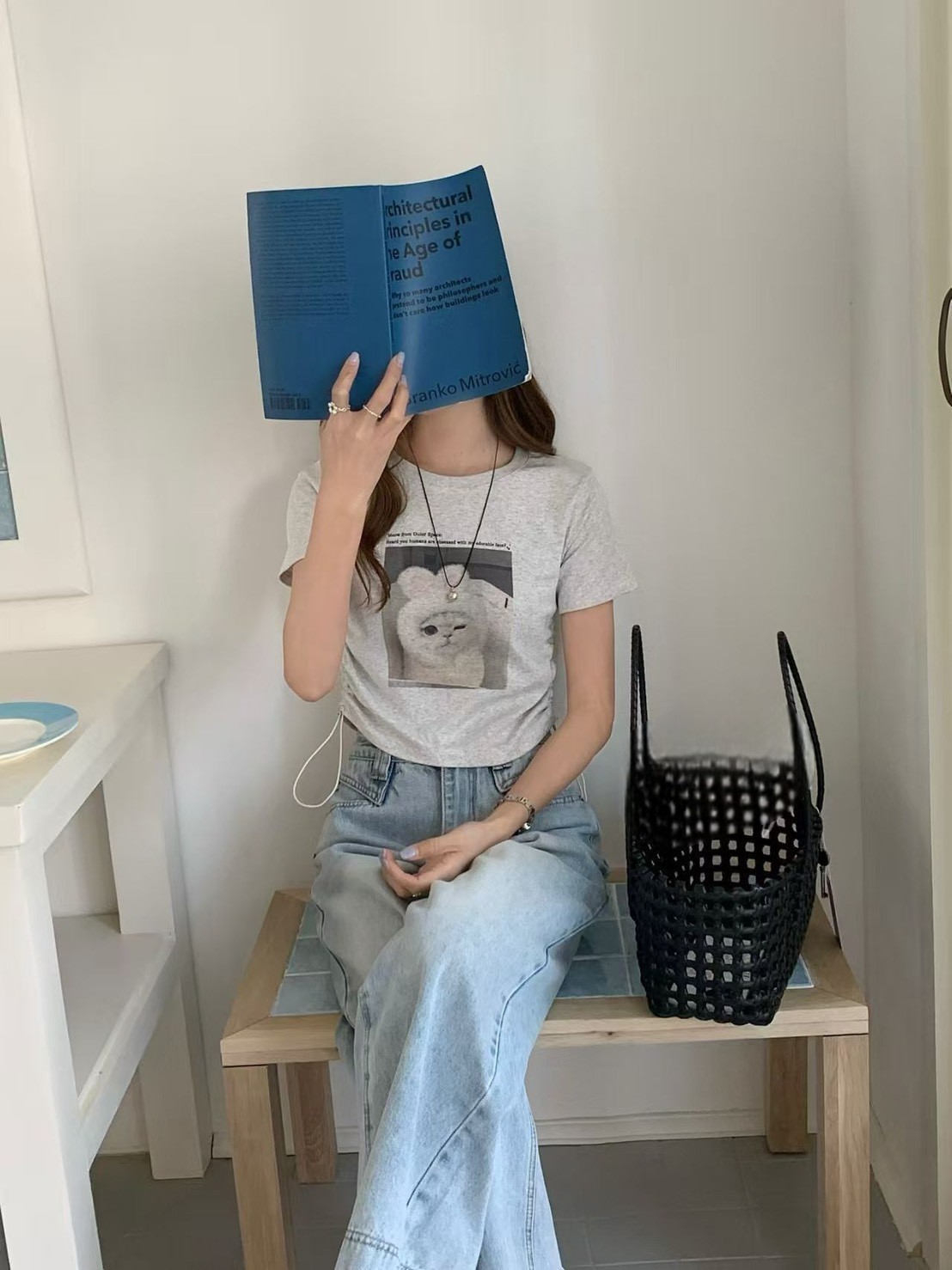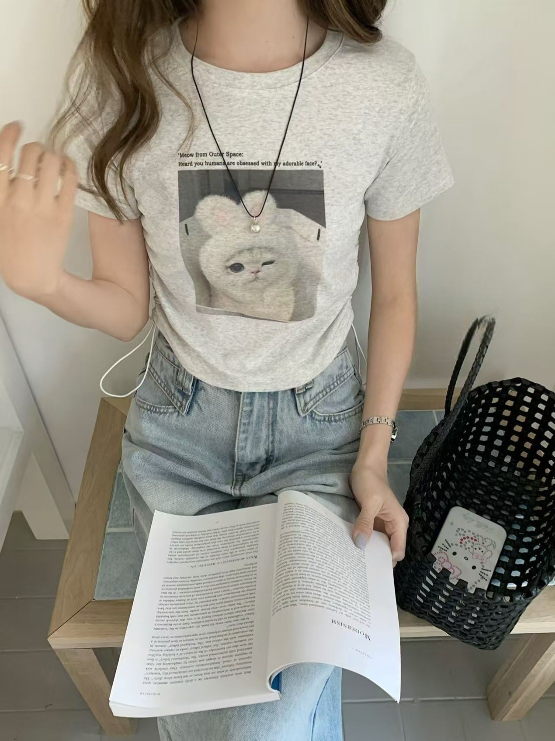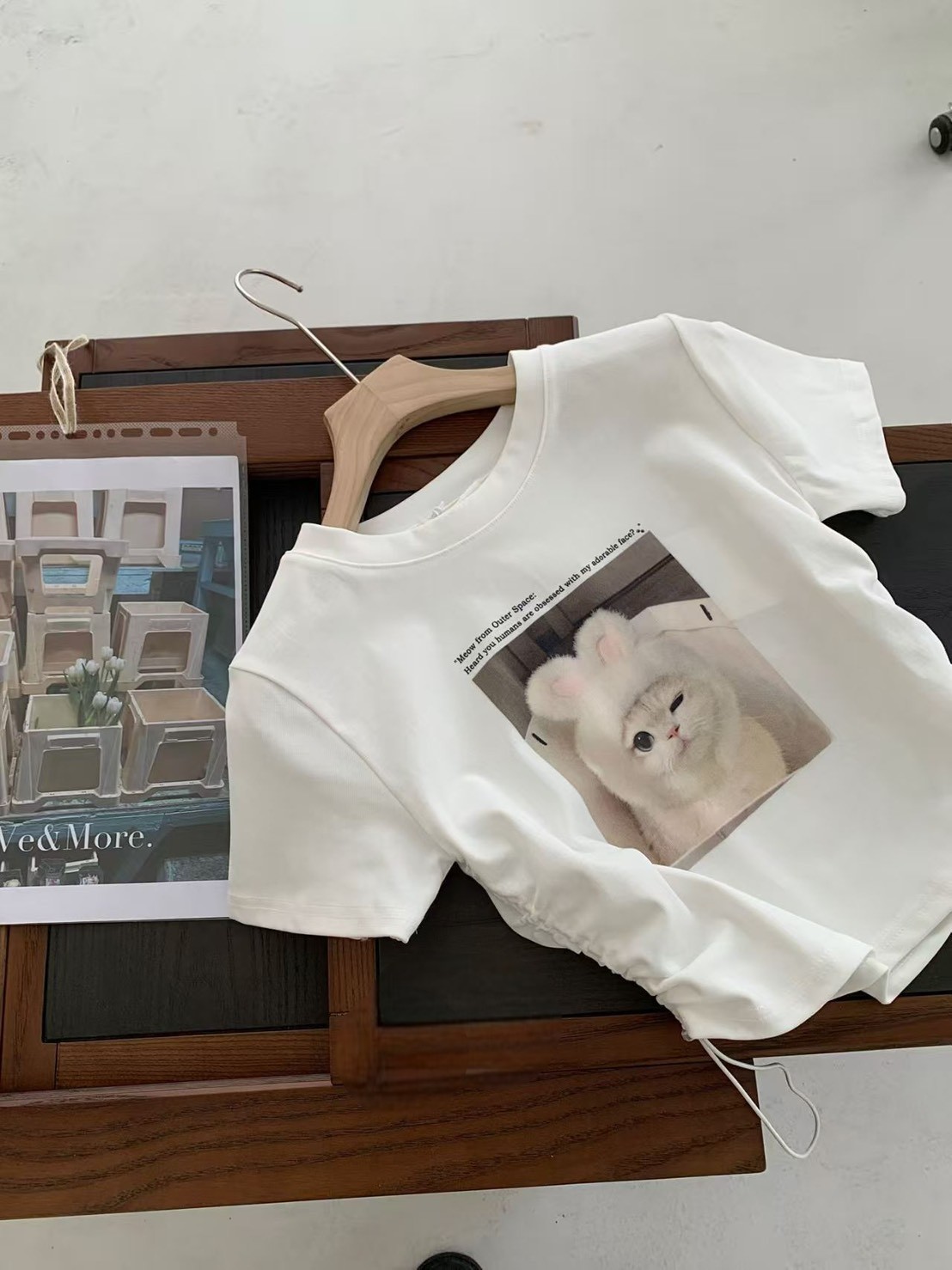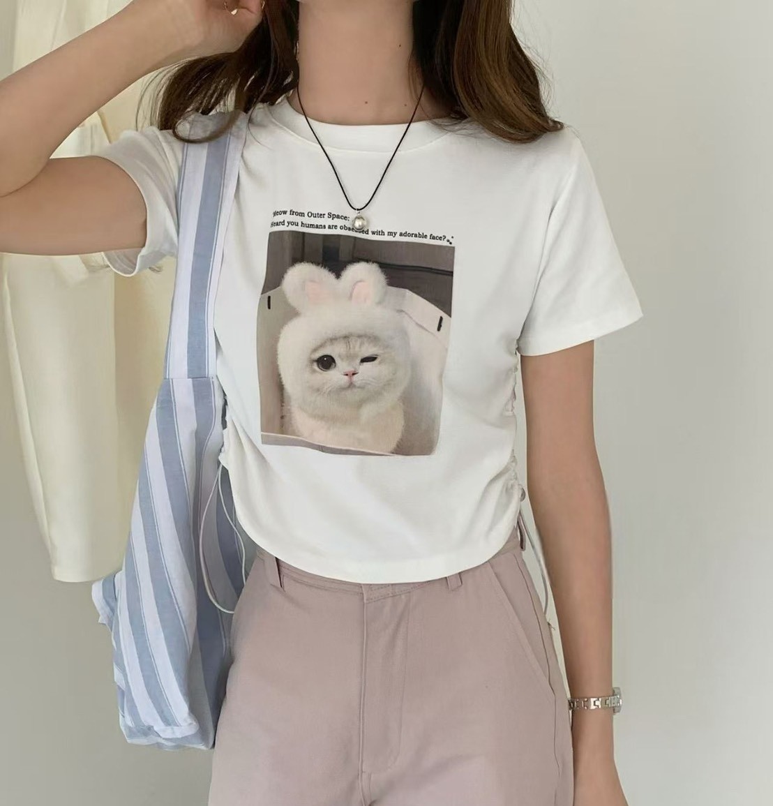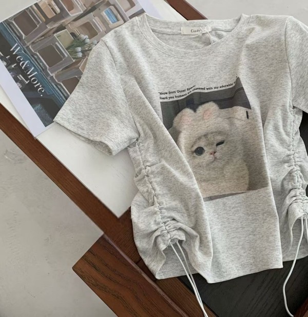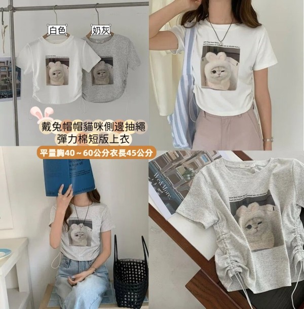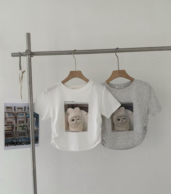 WSD41628女裝戴兔帽帽貓咪側邊抽繩彈力棉短版上衣