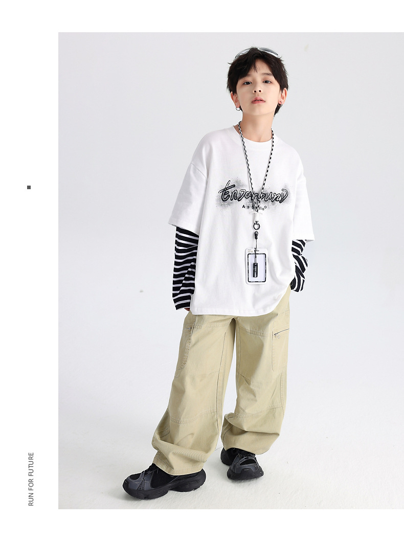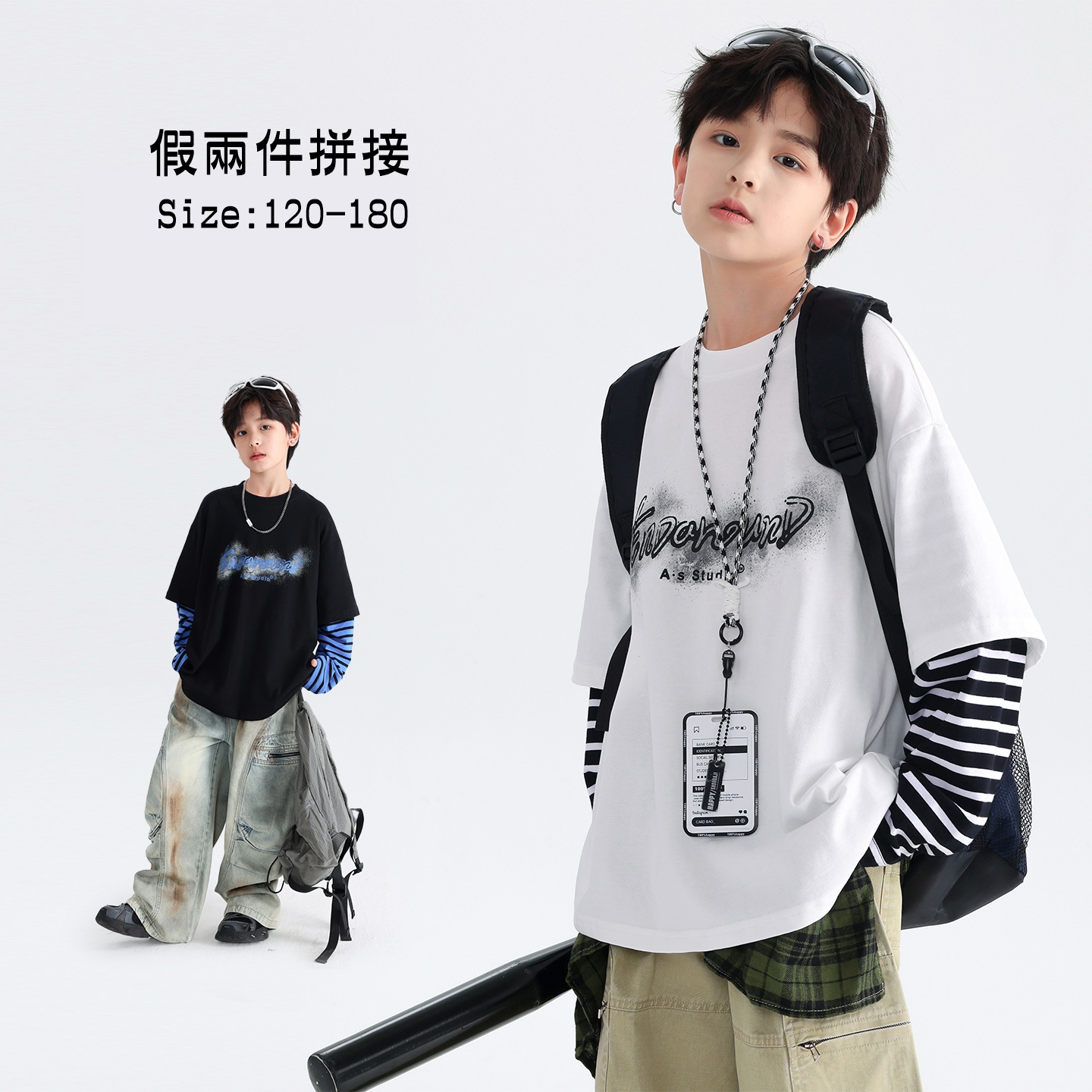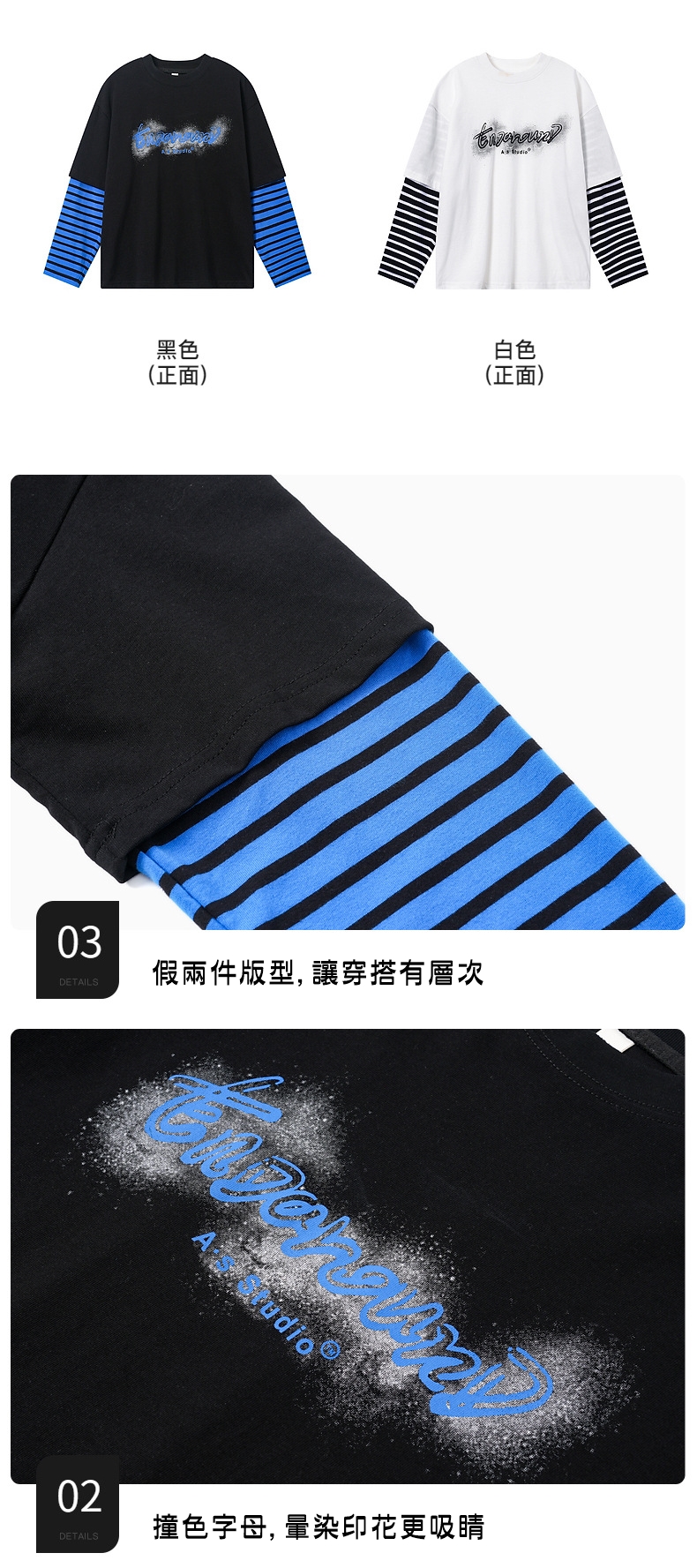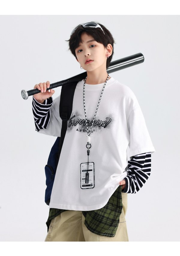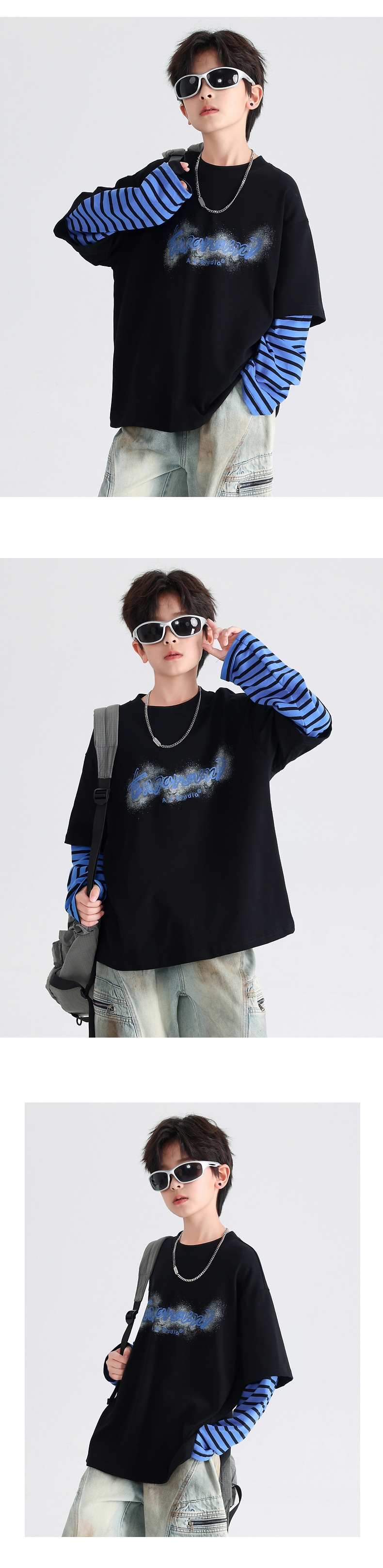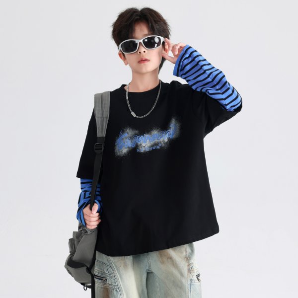 DSZ5789中大童字母撞色暈染假兩件條文袖上衣