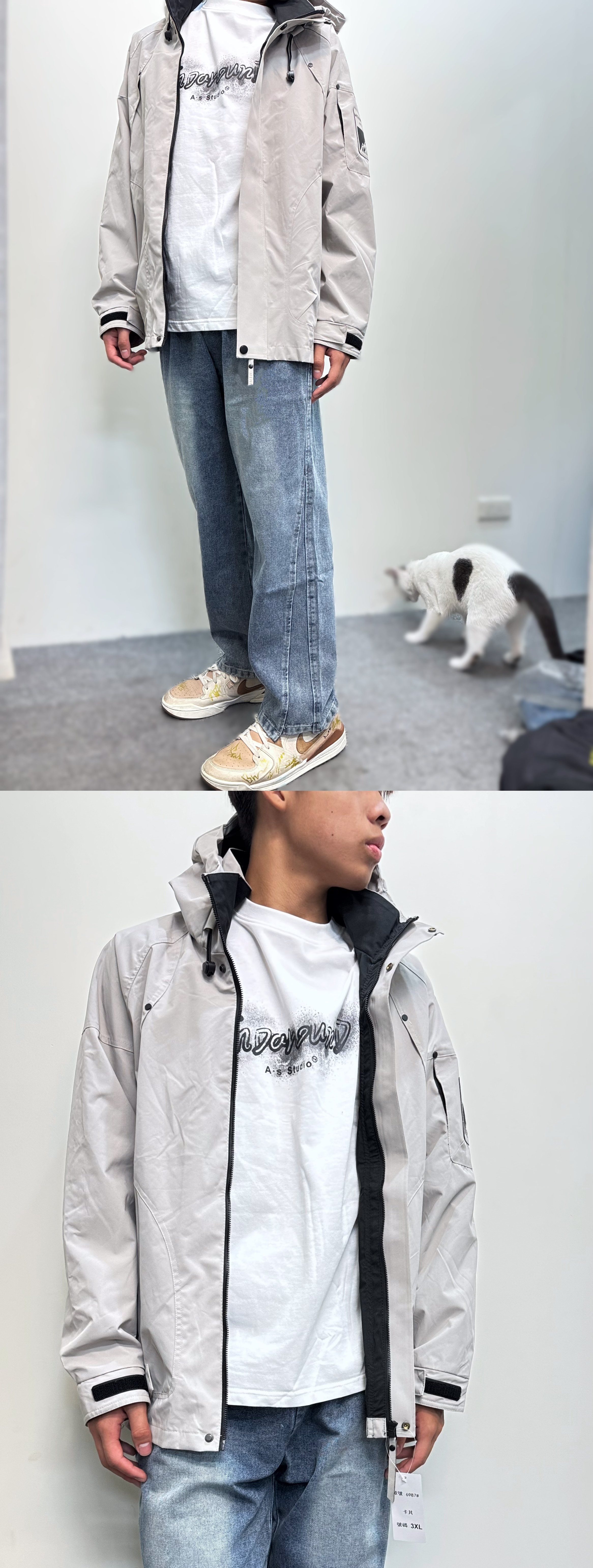 連帽+立領,拉鍊全拉下,