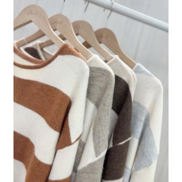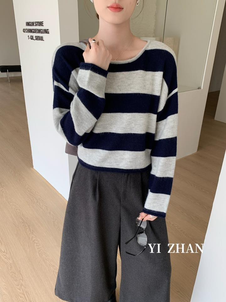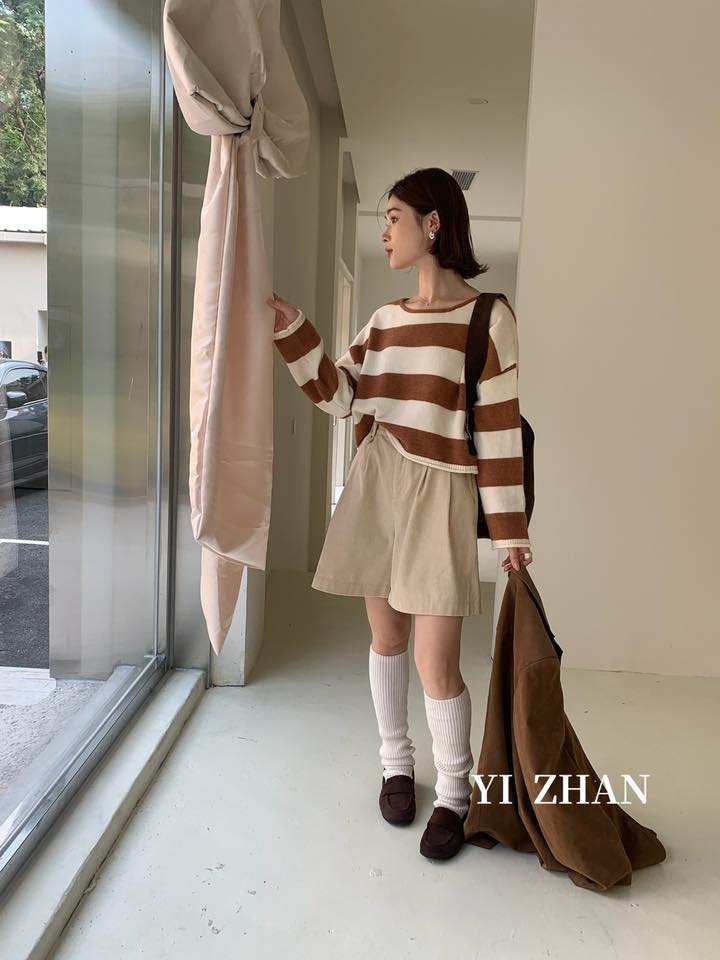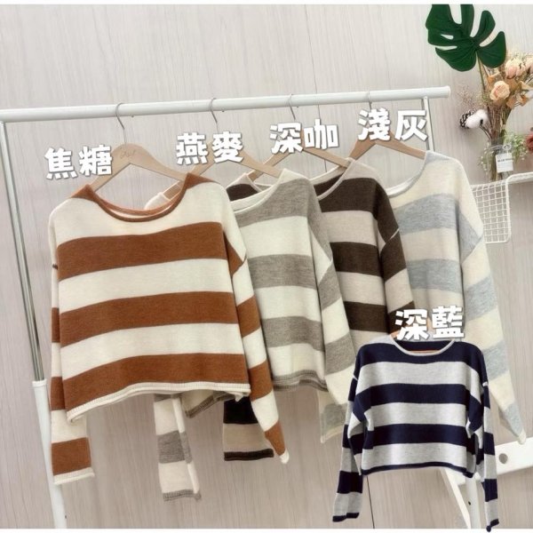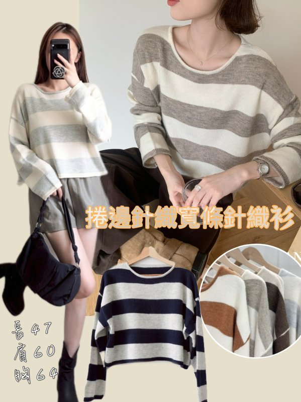 WSY8540女裝秋冬慵懶捲邊寬條短版針織衫