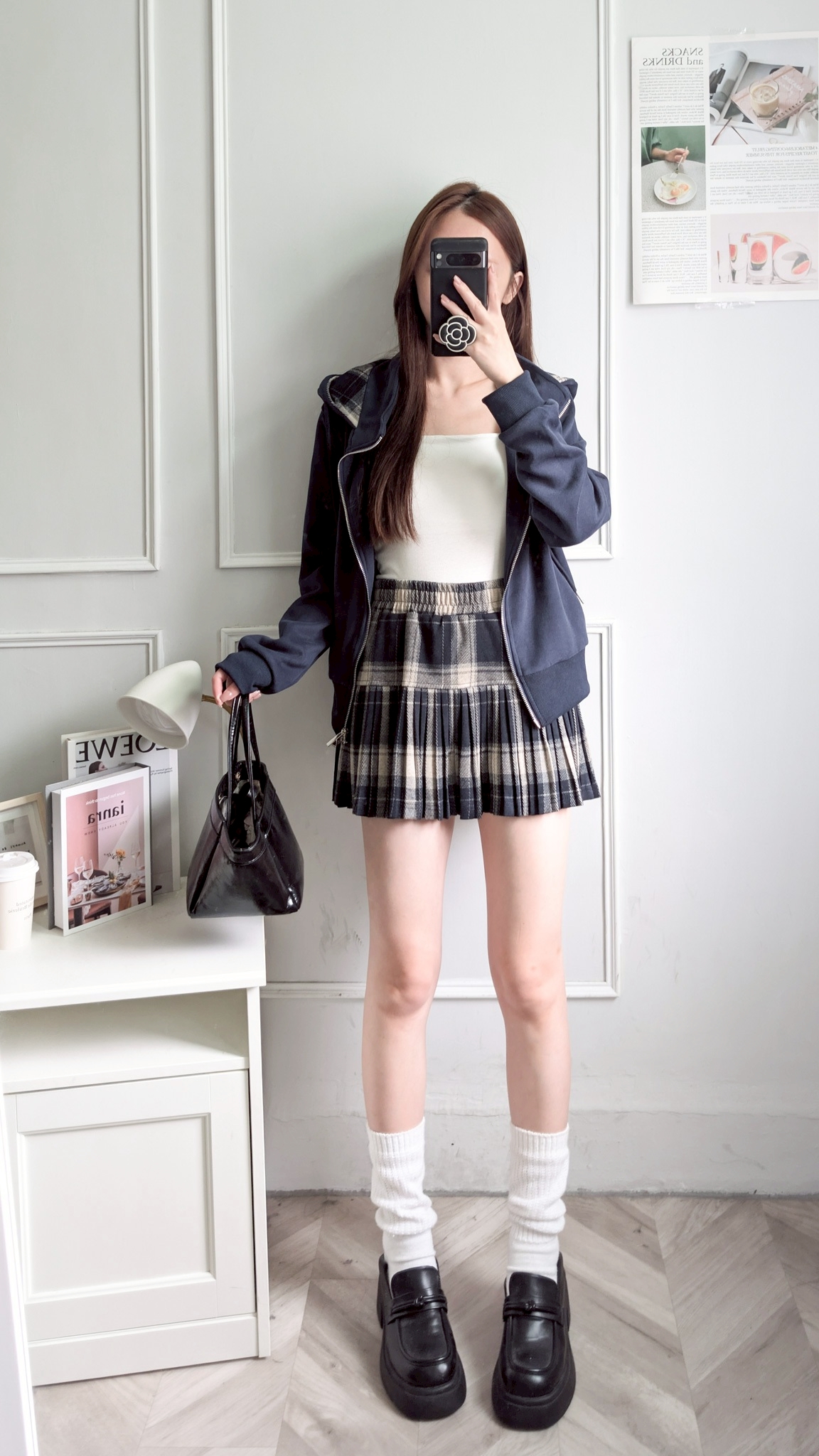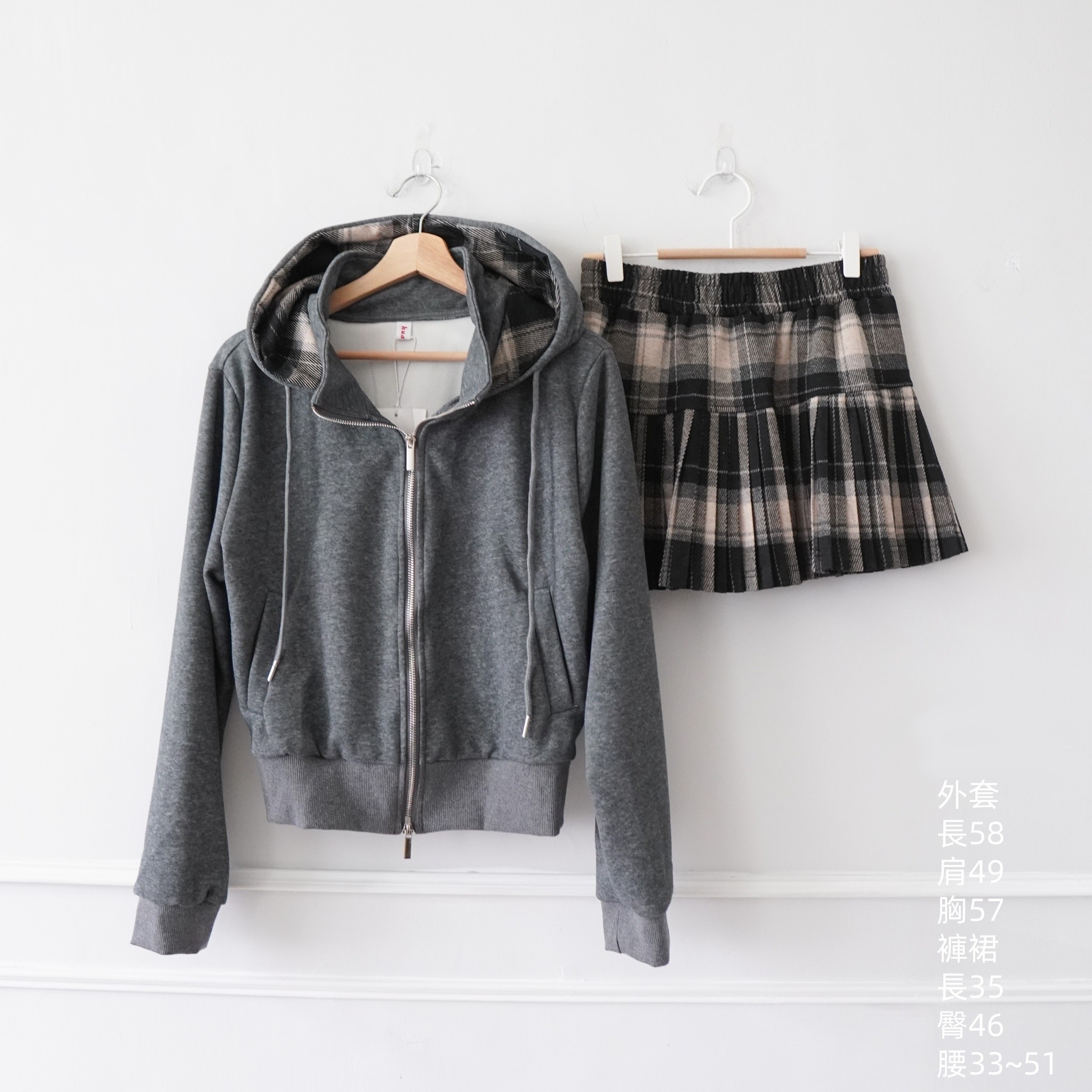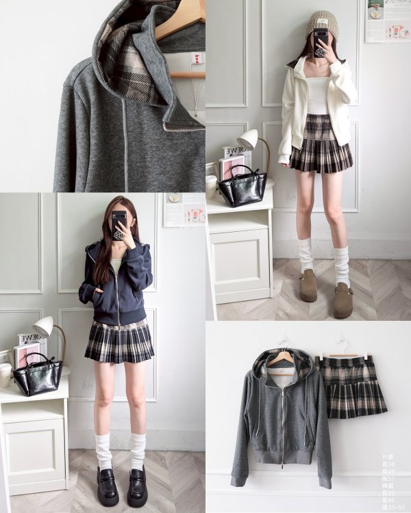 外套連帽內襯的格紋布料與百摺褲裙相呼應
