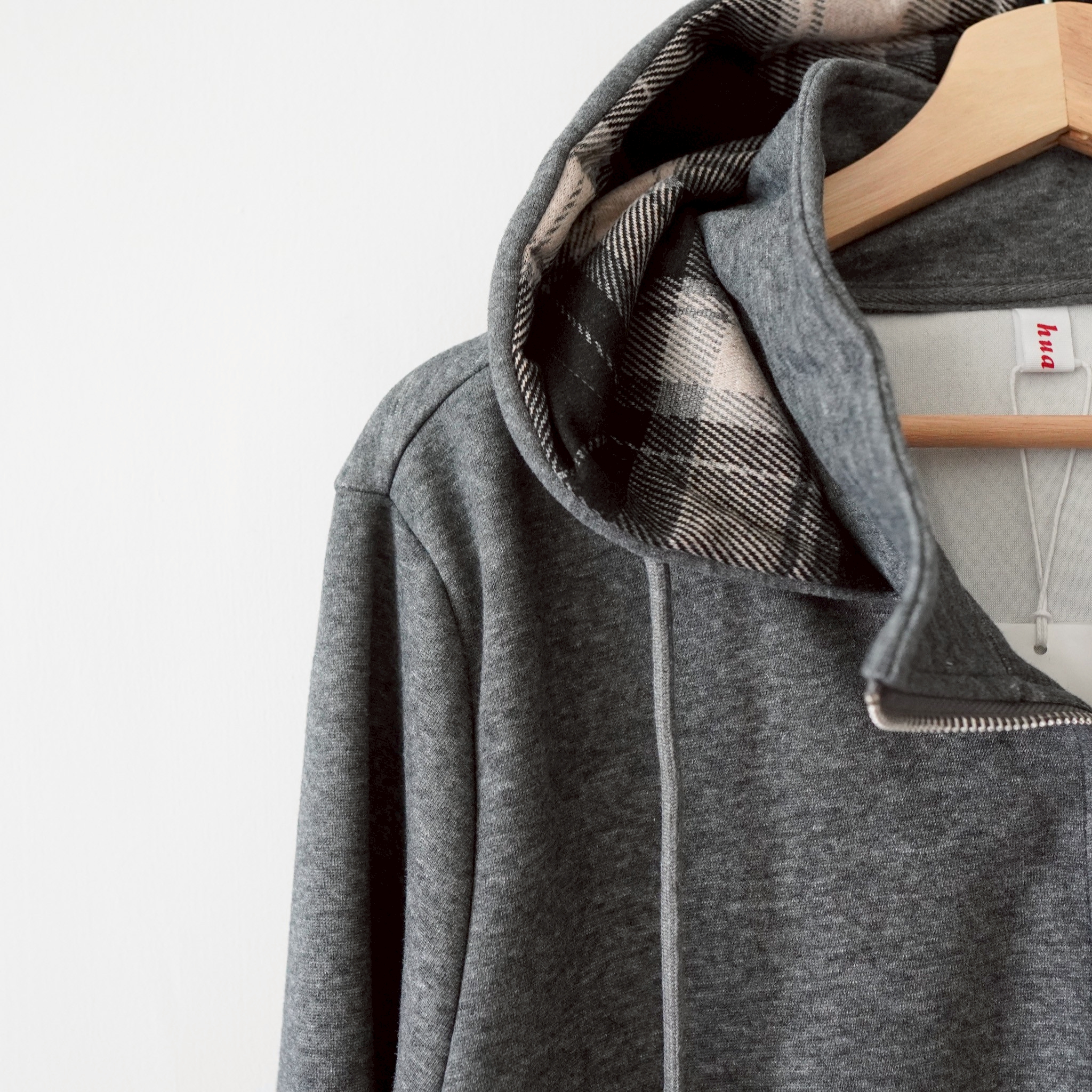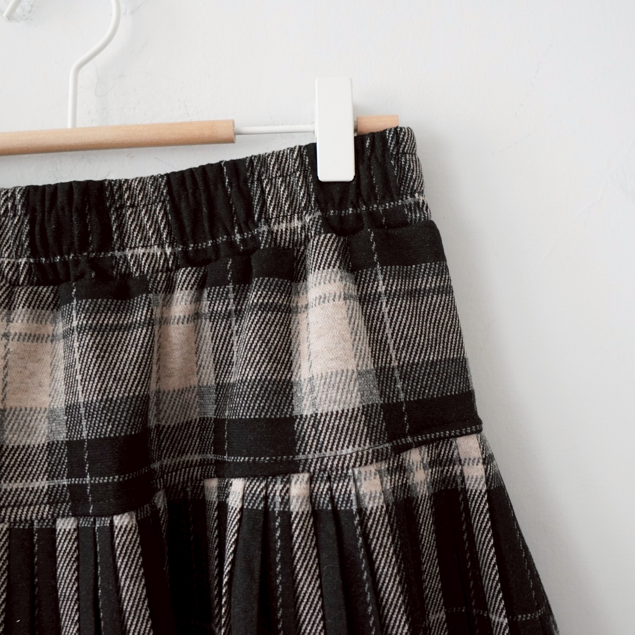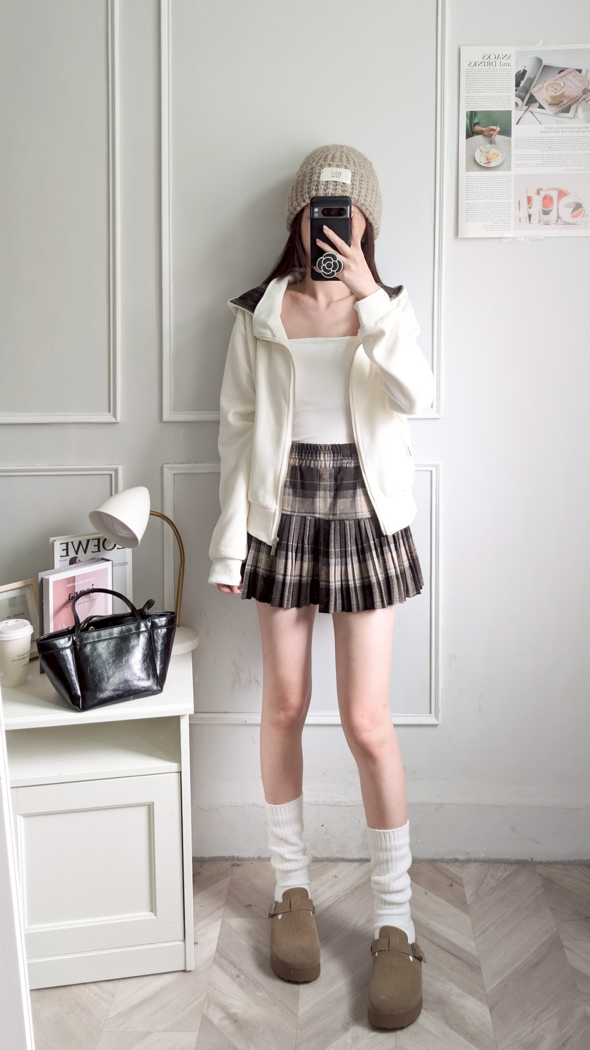 外套連帽內襯的格紋布料與百摺褲裙相呼應
