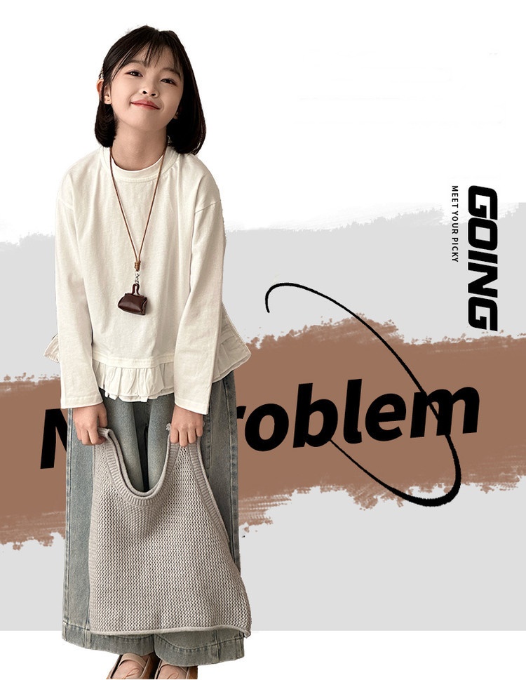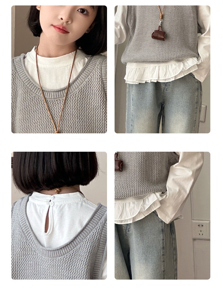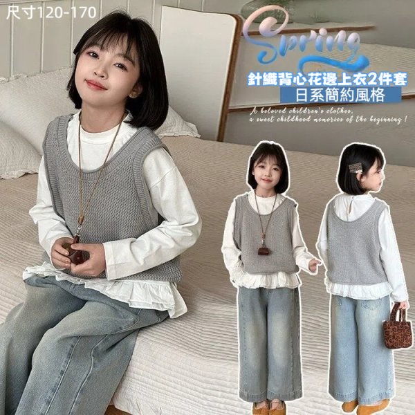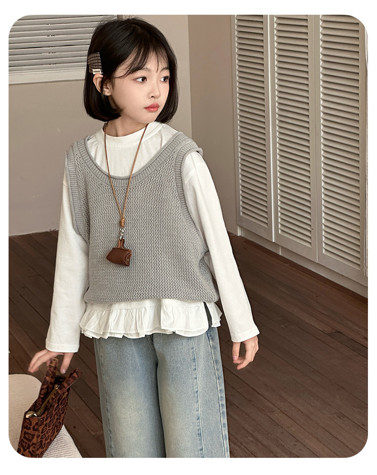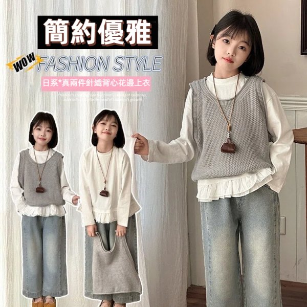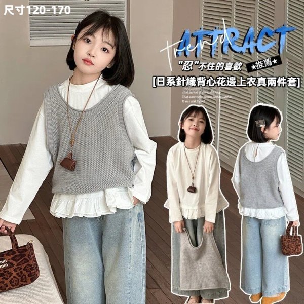 DJU2526中大女童日系針織背心花邊上衣真兩件套