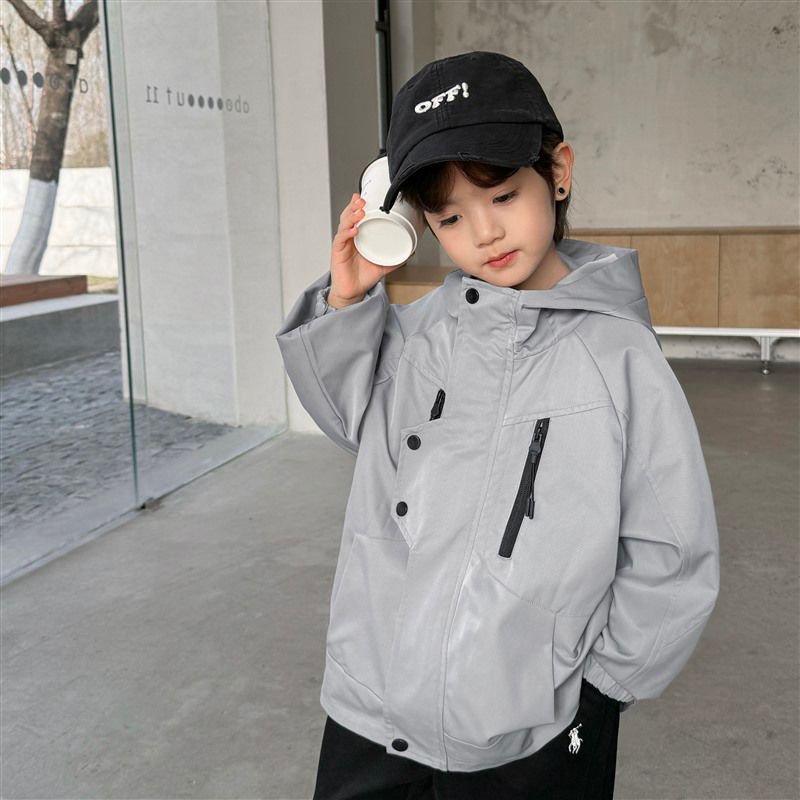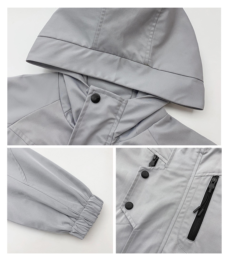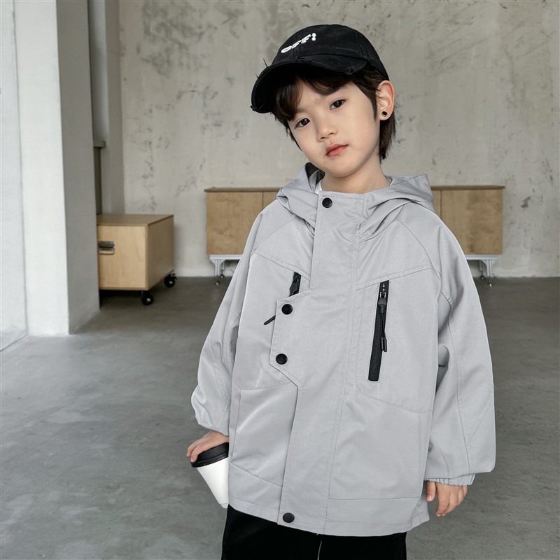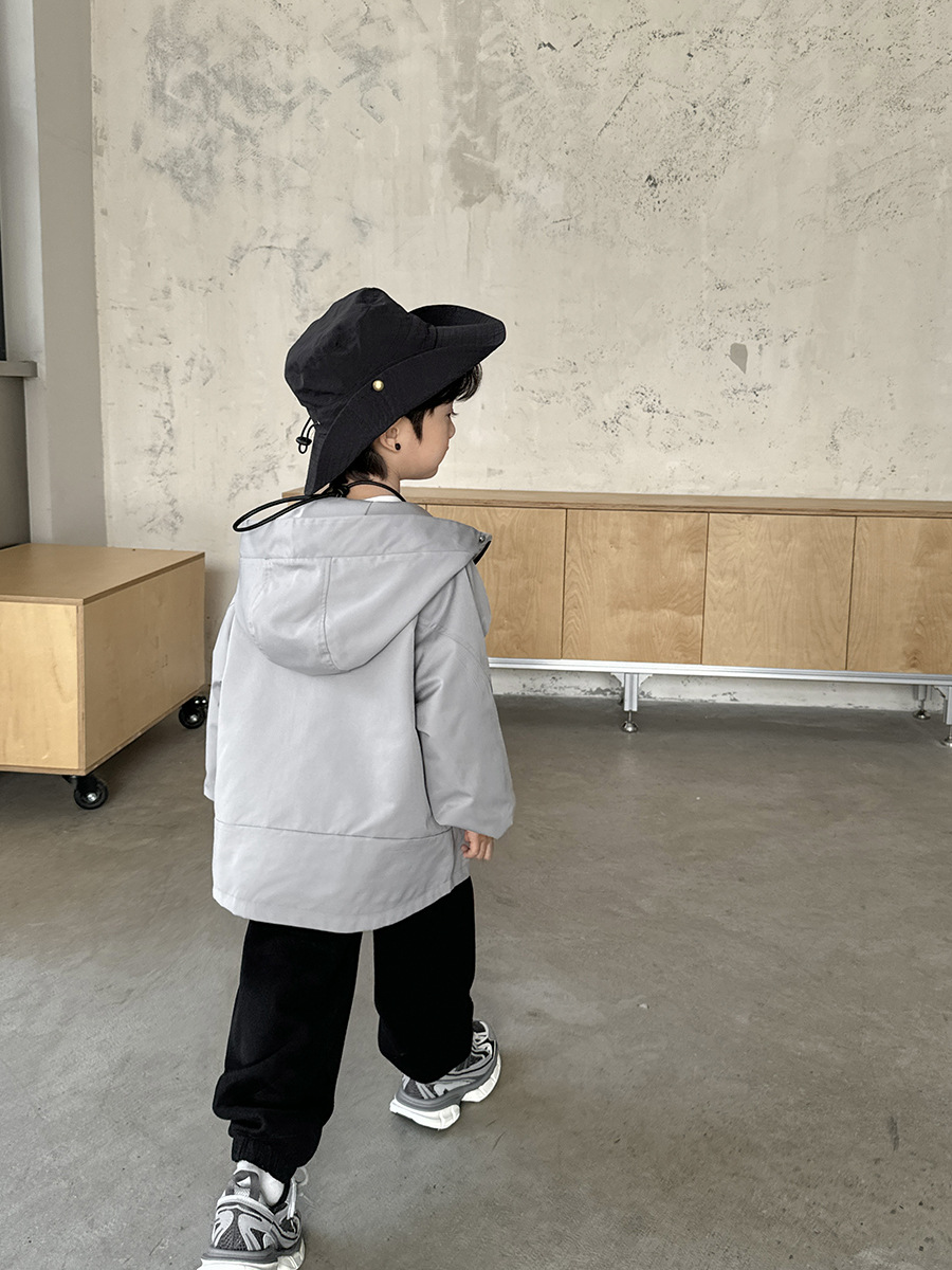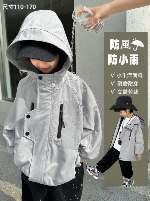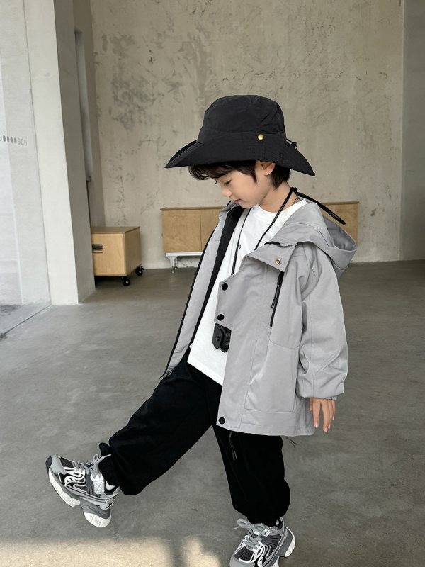 DHM2401男女中大童拉鍊造型扣灰色連帽風衣外套