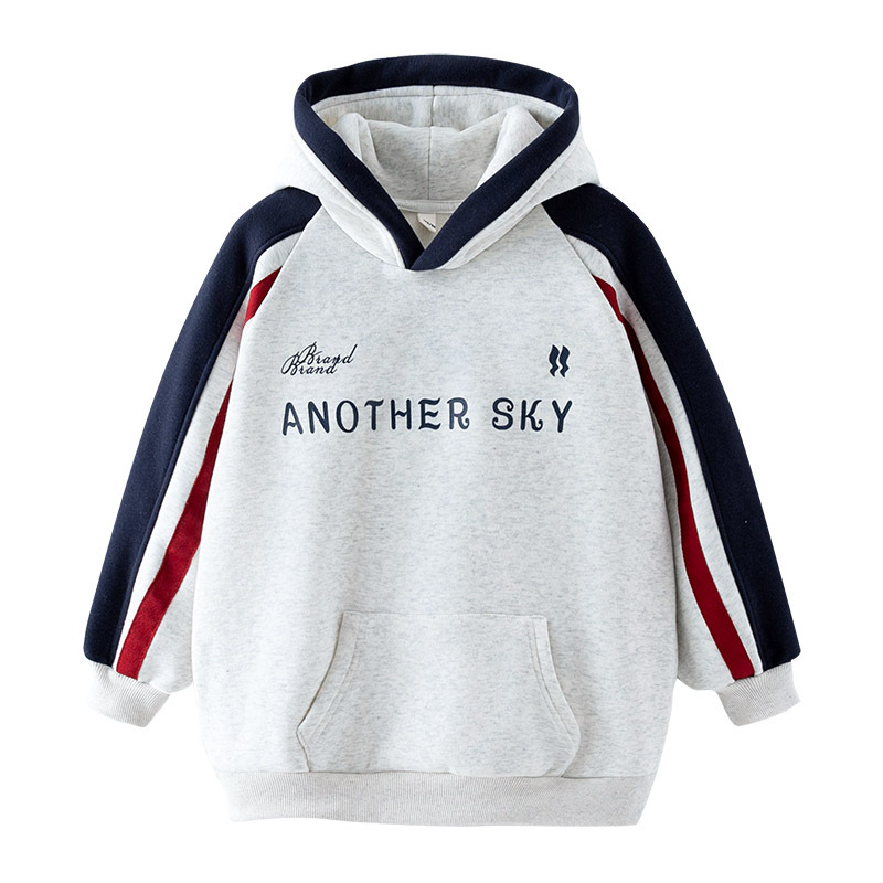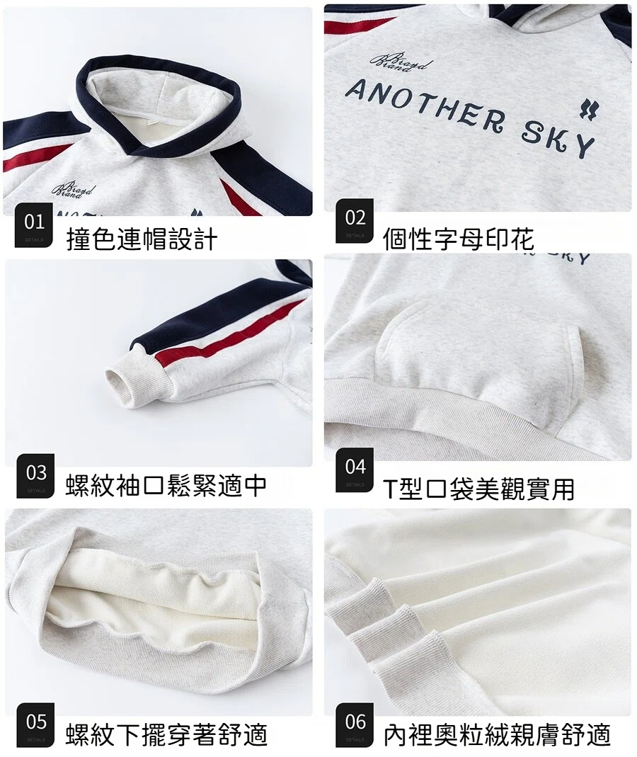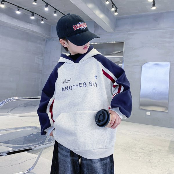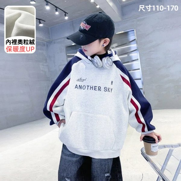 DSZ4890中大童帽沿撞色字母奧粒絨拼接袖帽T