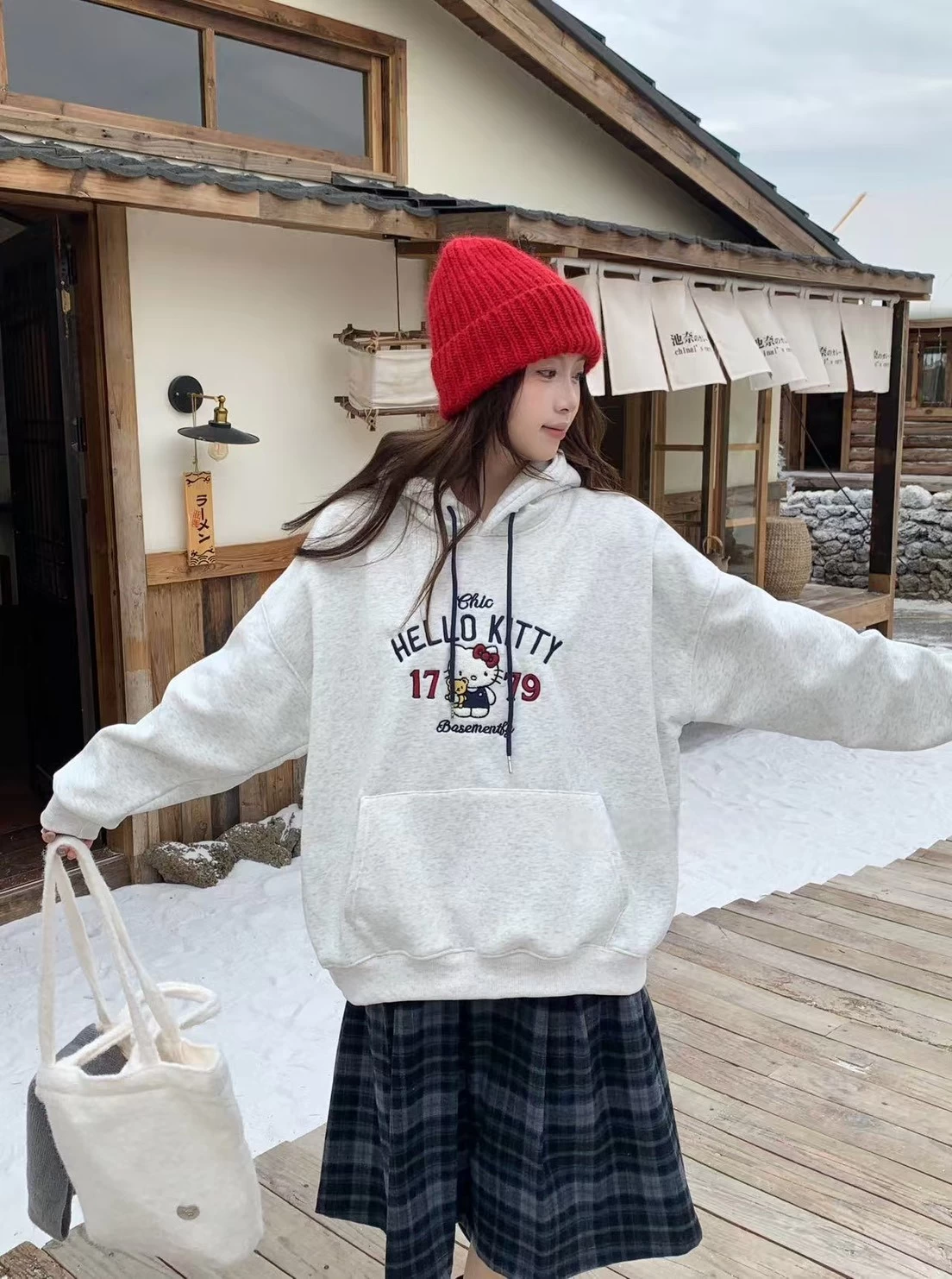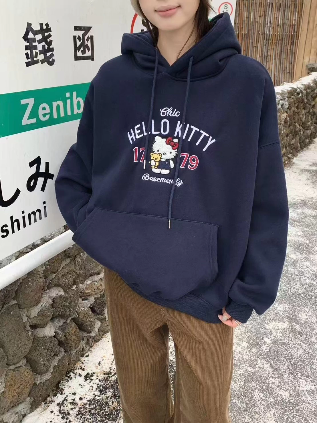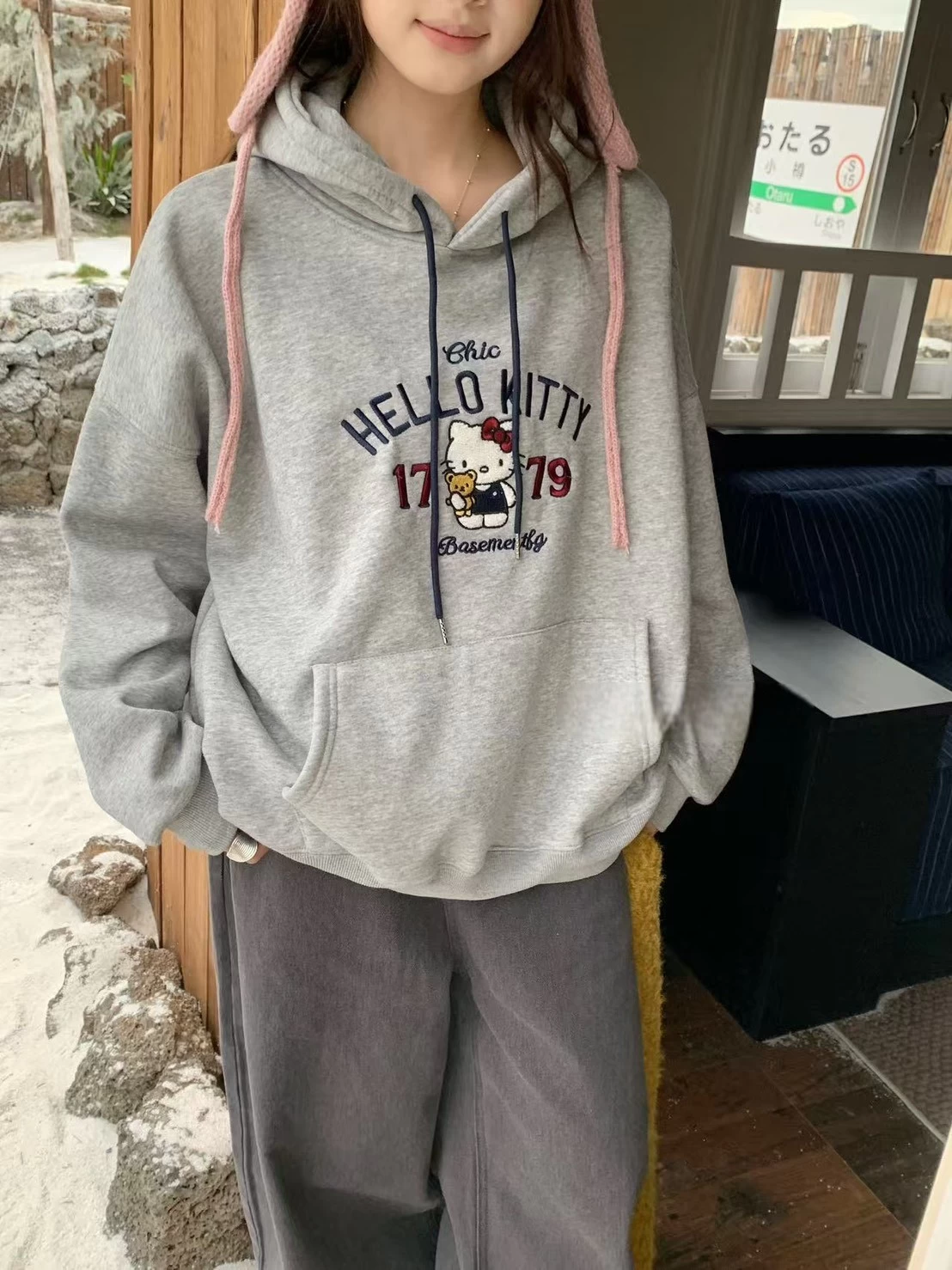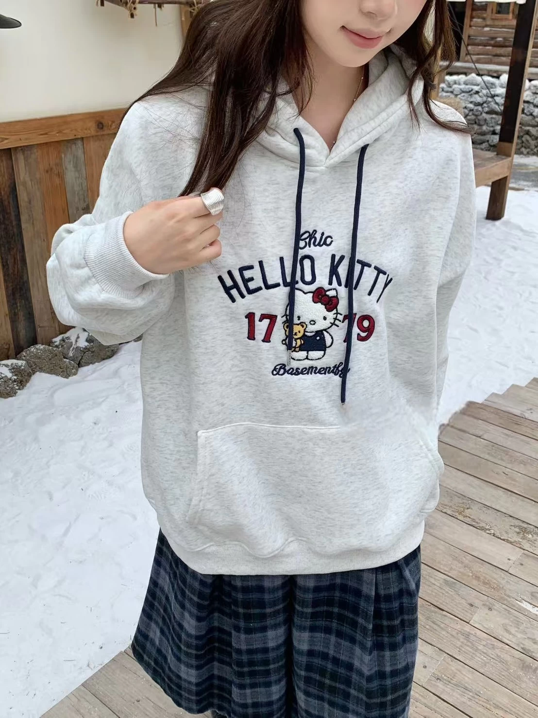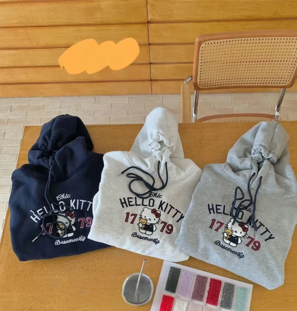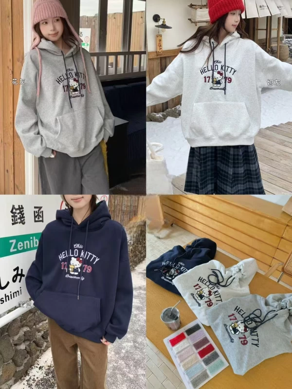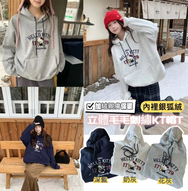 WSD11308女裝立體毛毛刺繡KT銀狐絨連帽T型口袋帽T