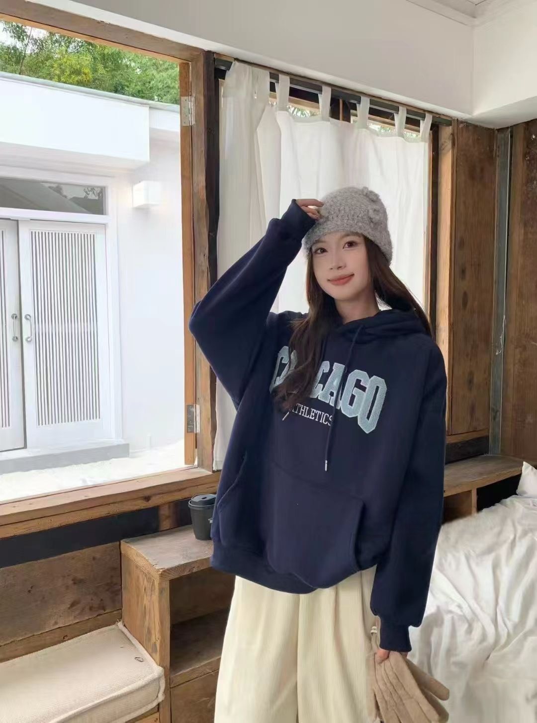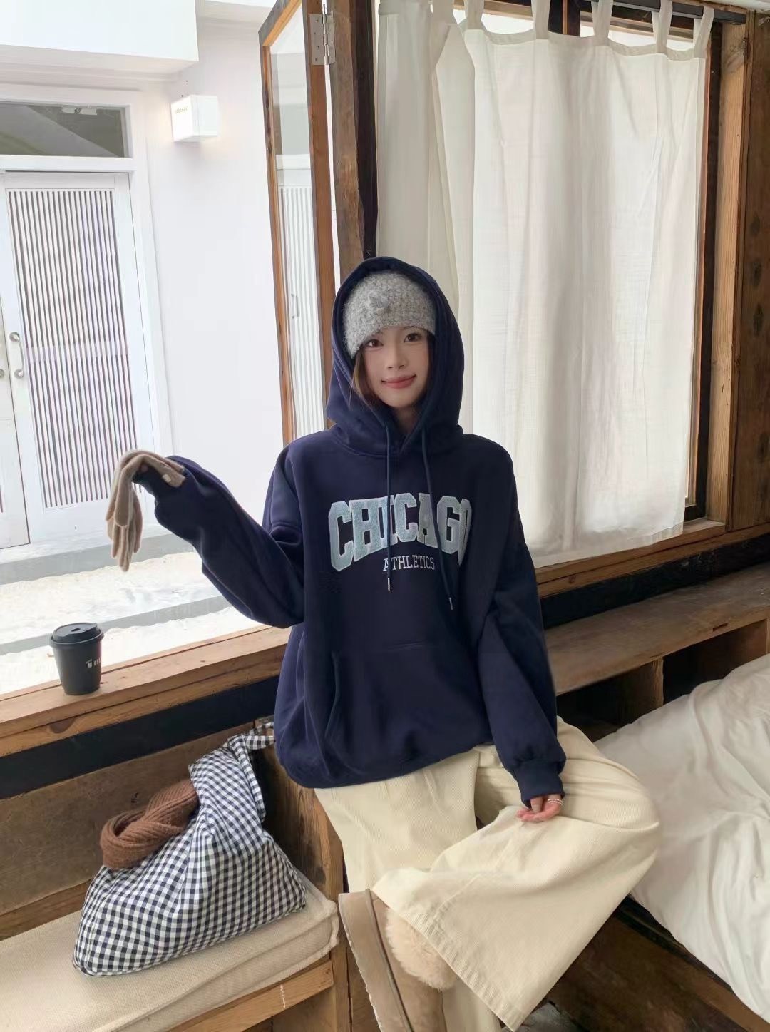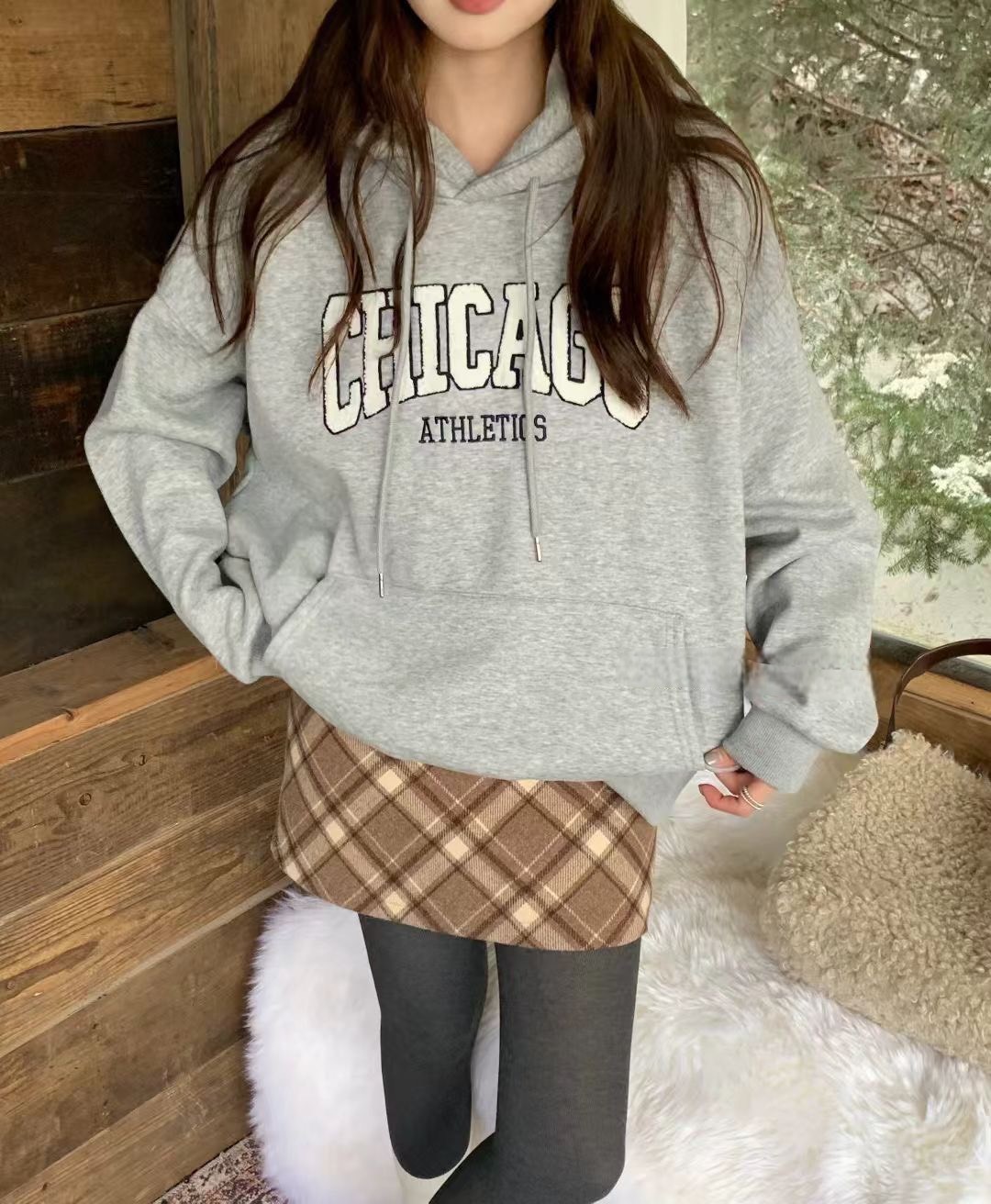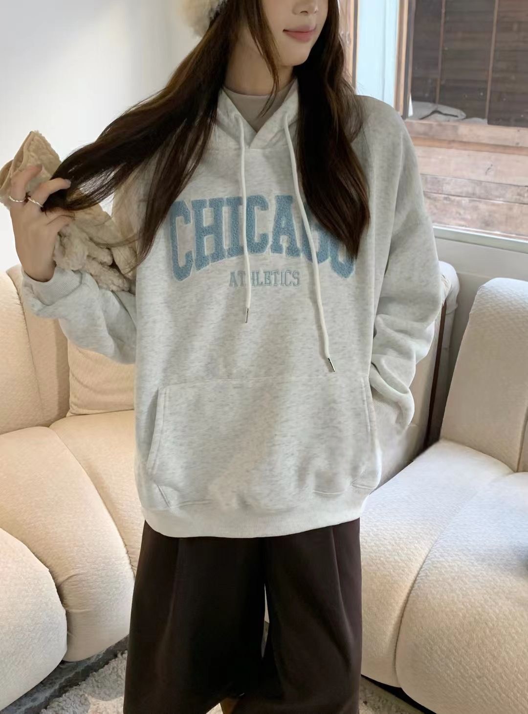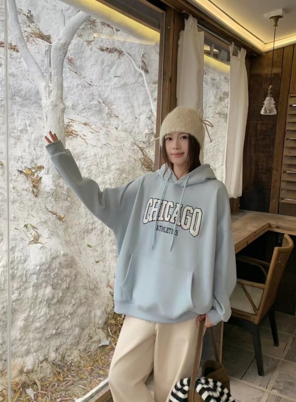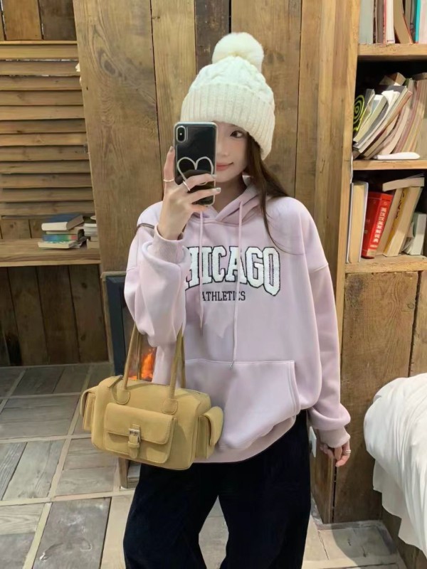 WSD11301女裝立體毛毛刺繡字母CHICAGO連帽帽T