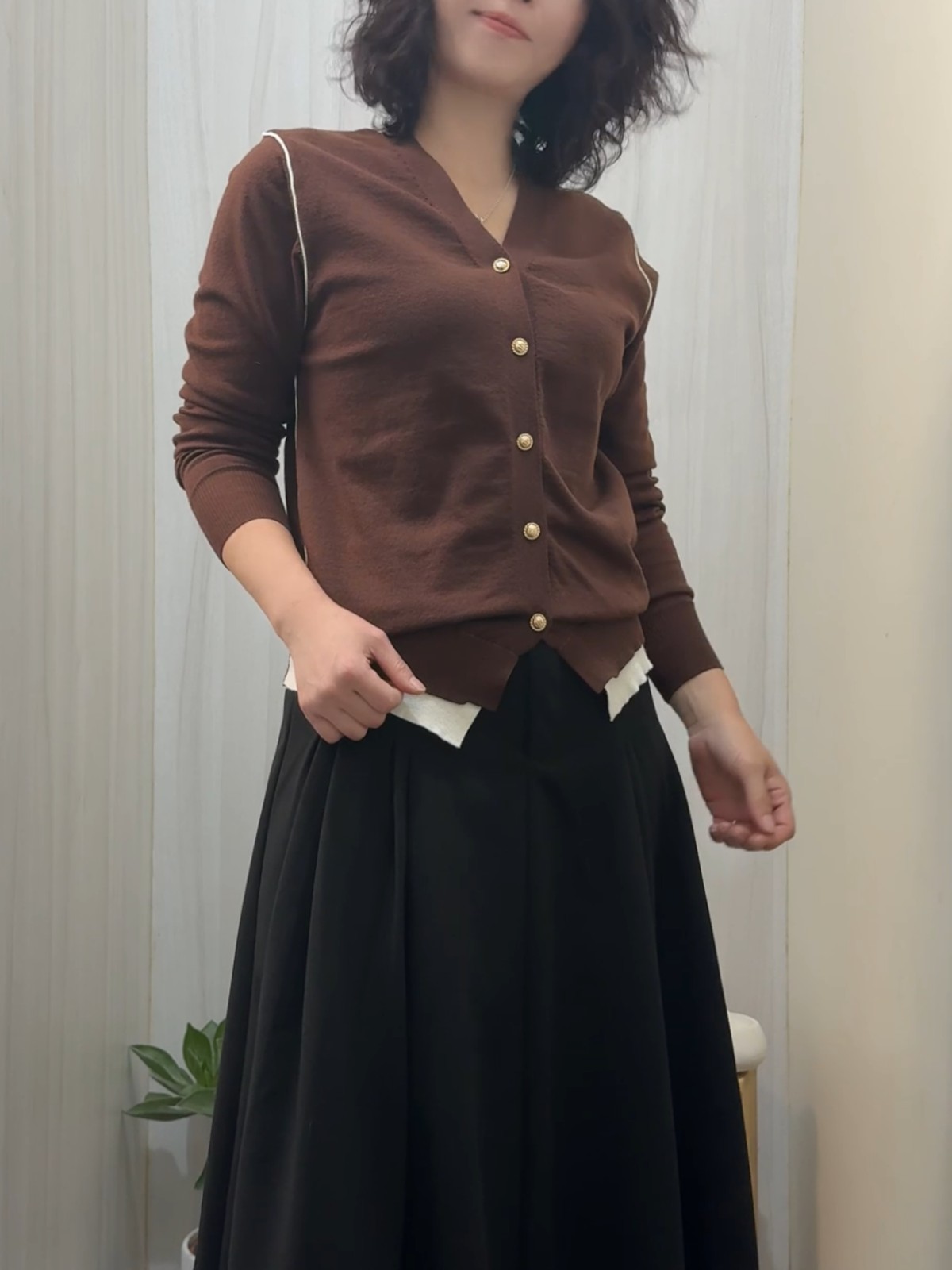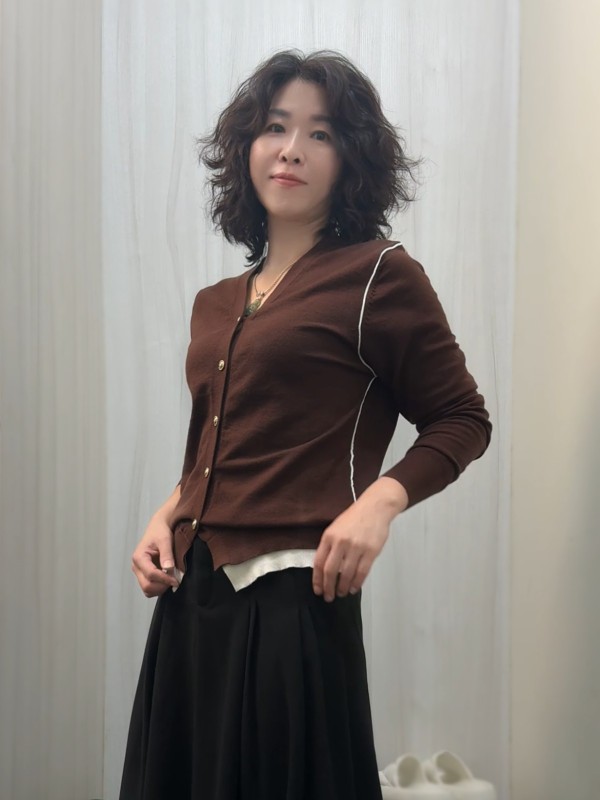 DBB9496女裝美拉德開釦假兩件咖色針織衫