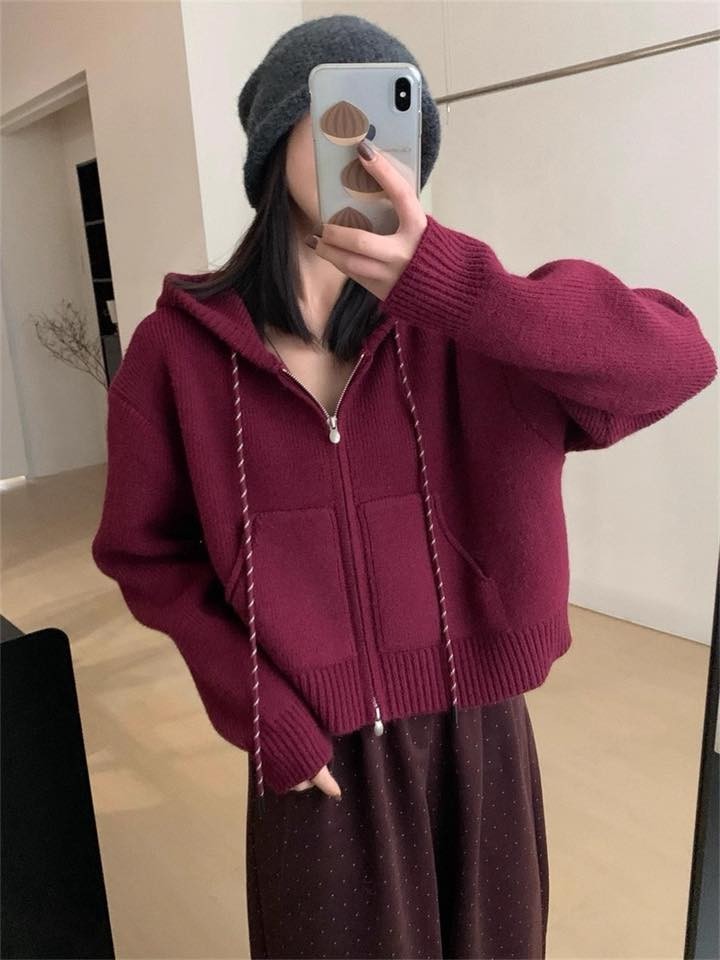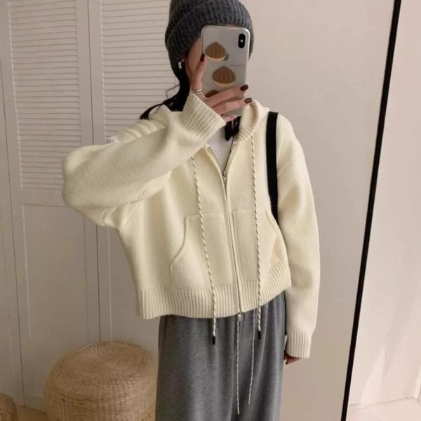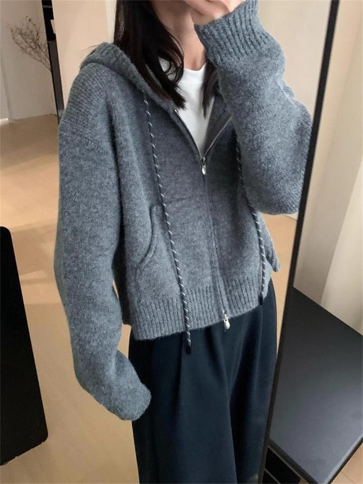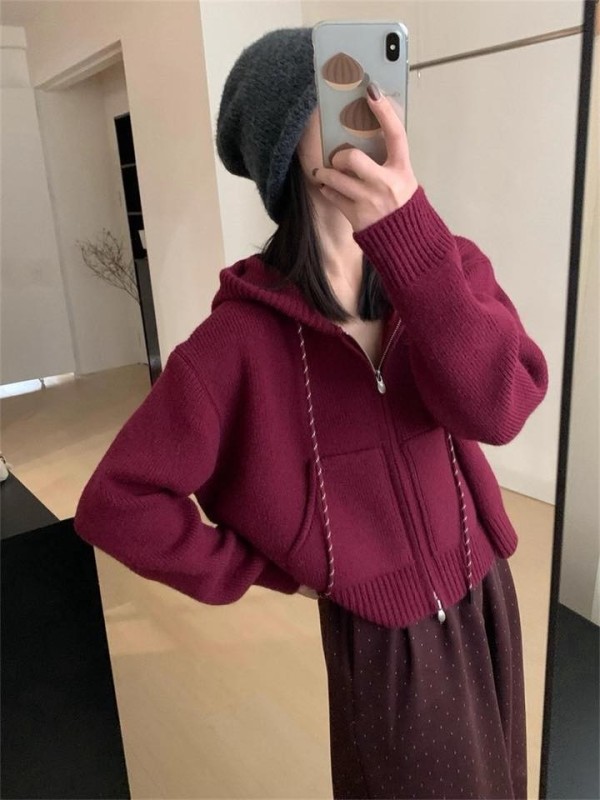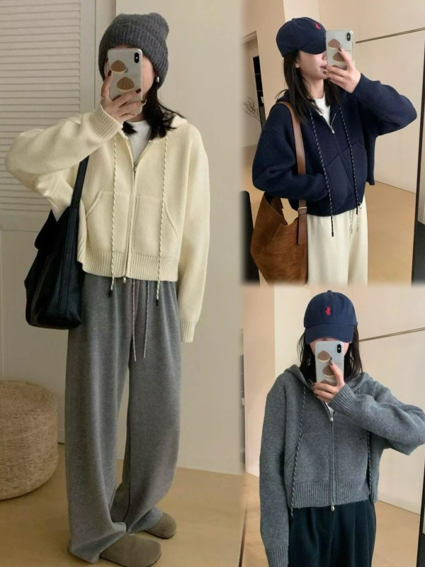 WDH107646女裝配色繩拉練針織連帽外套