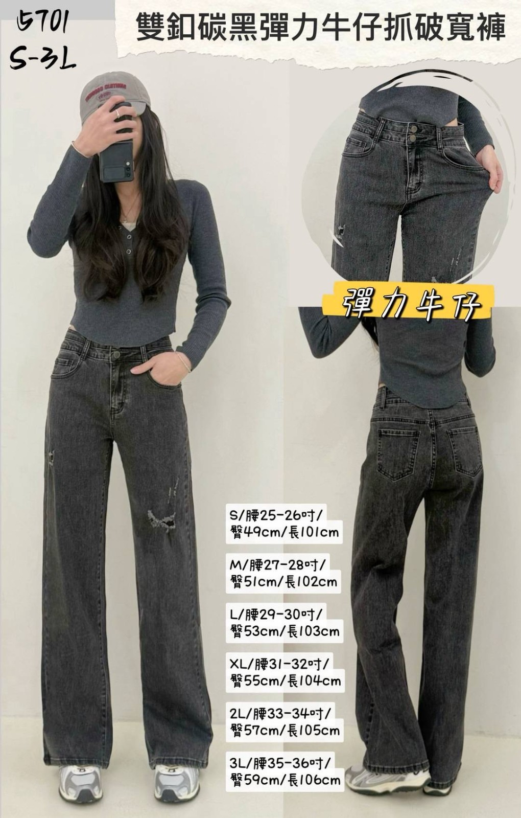 WCH5701 雙鈕碳黑彈力抓破寬褲」