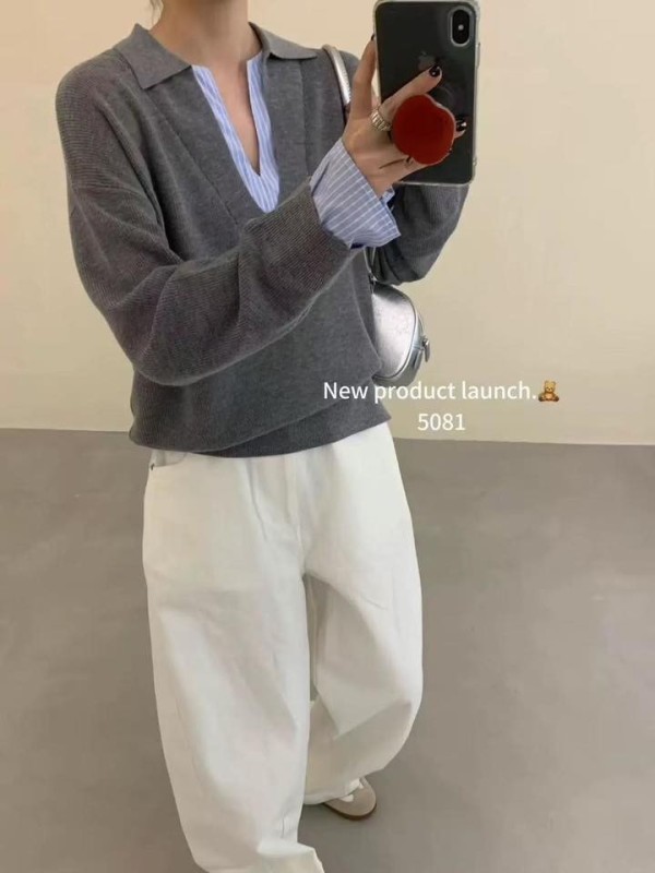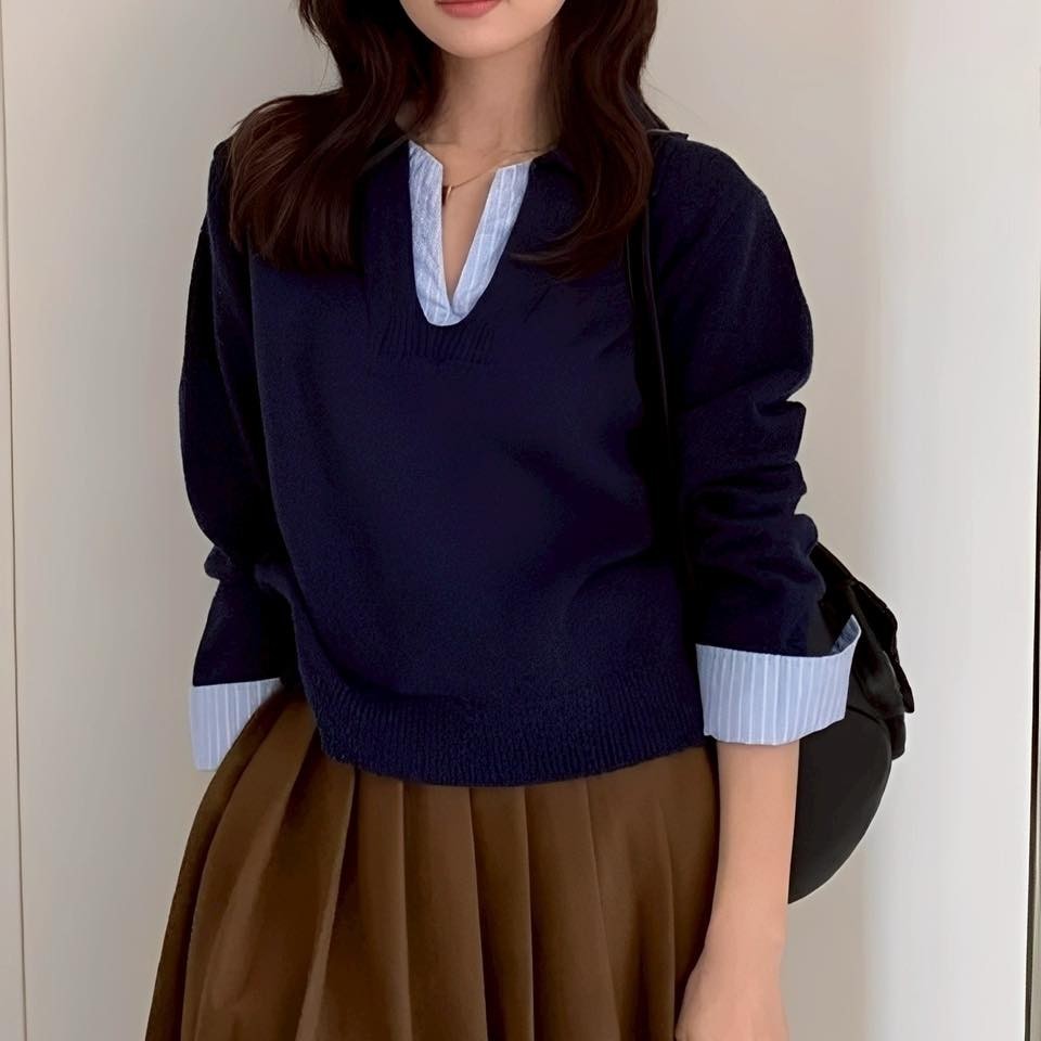 WDH107681 正韓原單拼接POLO襯衫領假兩件針織衣