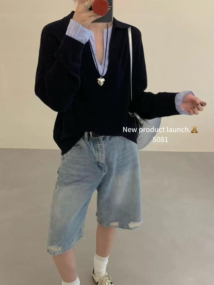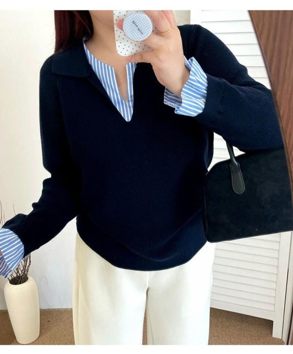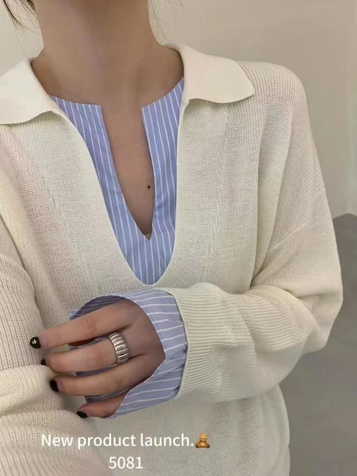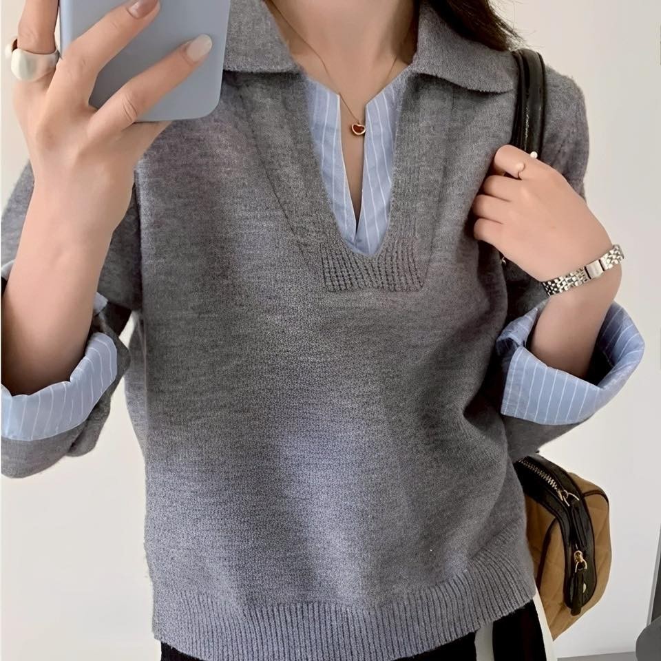 正韓原單拼接襯衫假兩件V領針織上衣
