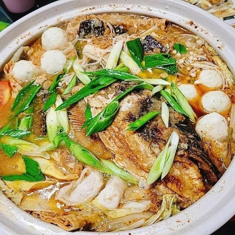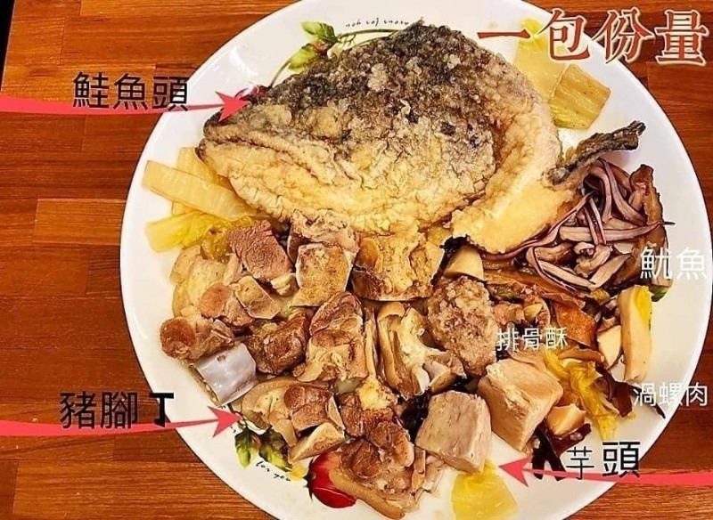 📌內容物:半顆鮭魚頭+、砂鍋菜、獅子頭、豬腳丁、芋頭、黑木耳、魷魚、渦螺肉...
