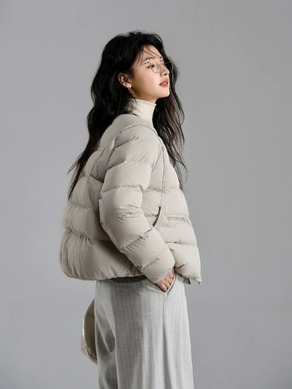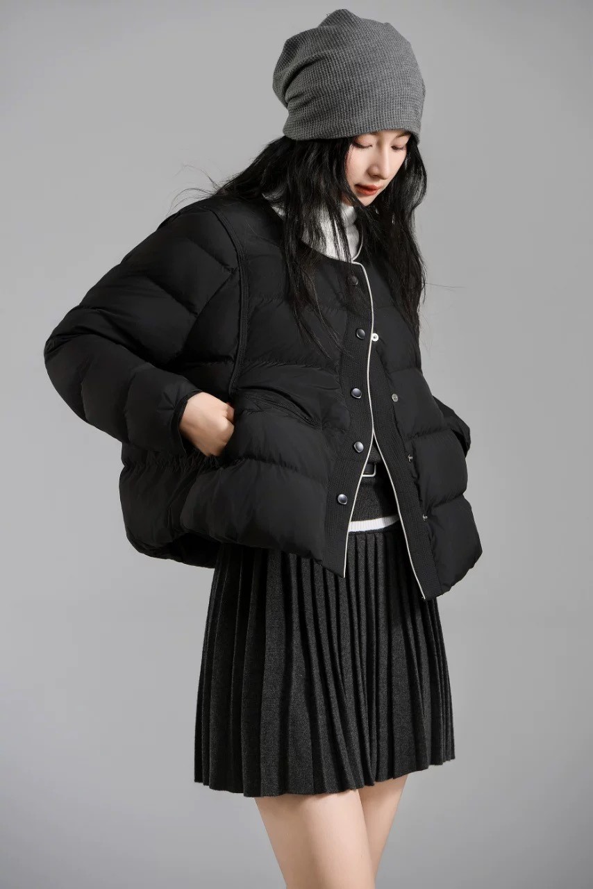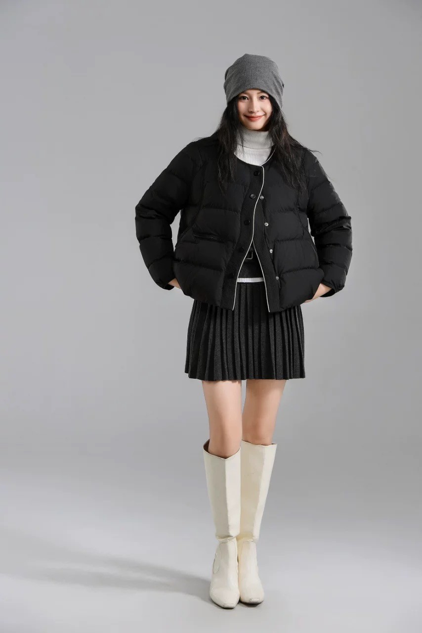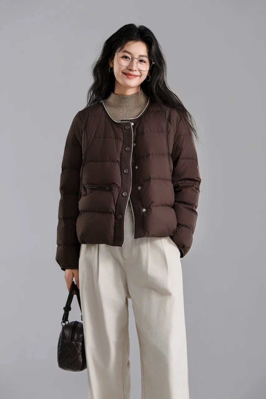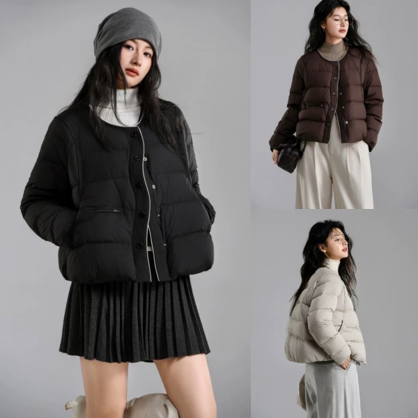 DYC6681女裝撞色滾邊圓領中短版羽絨外套