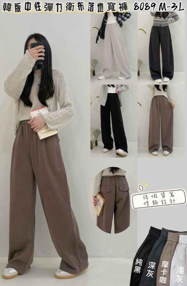 8089 M-3L 韓版男友牌衛布厚磅彈力落地寬褲]