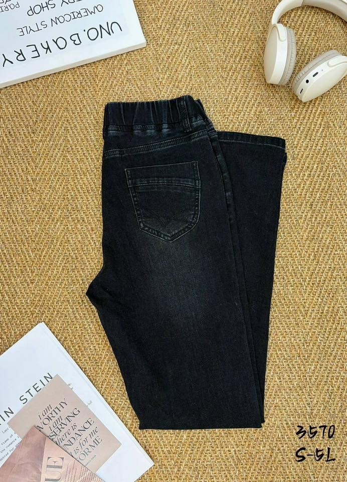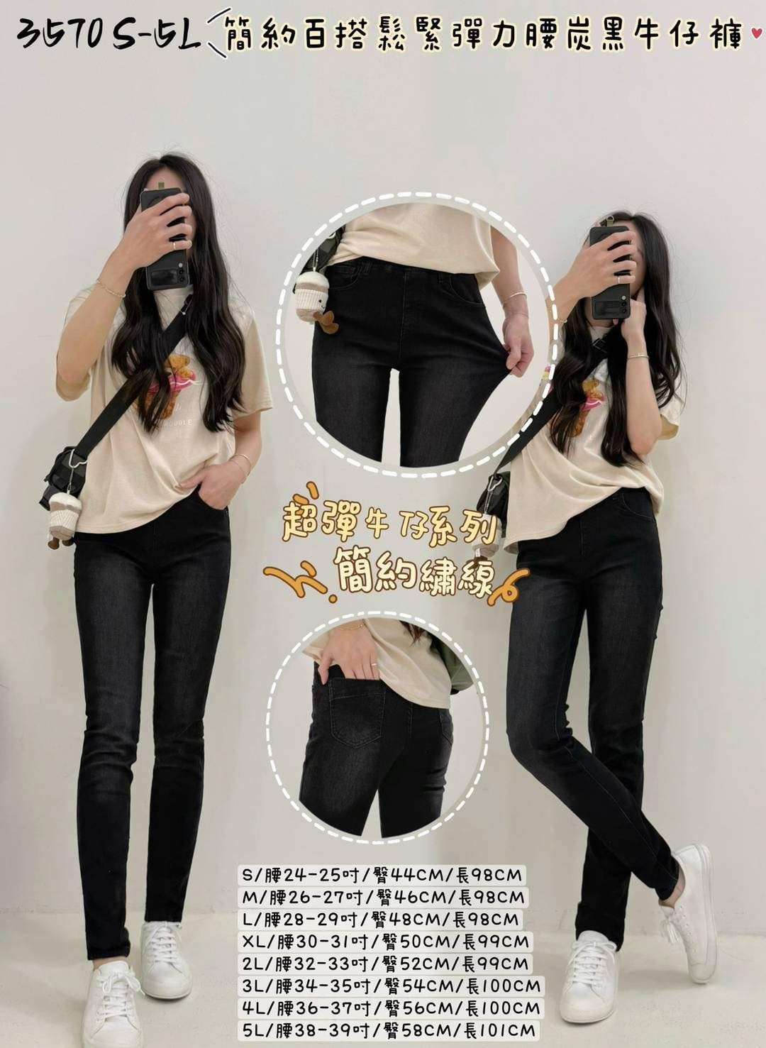 3570 S-5L 簡約繡線鬆緊腰彈力微刷黑牛仔褲