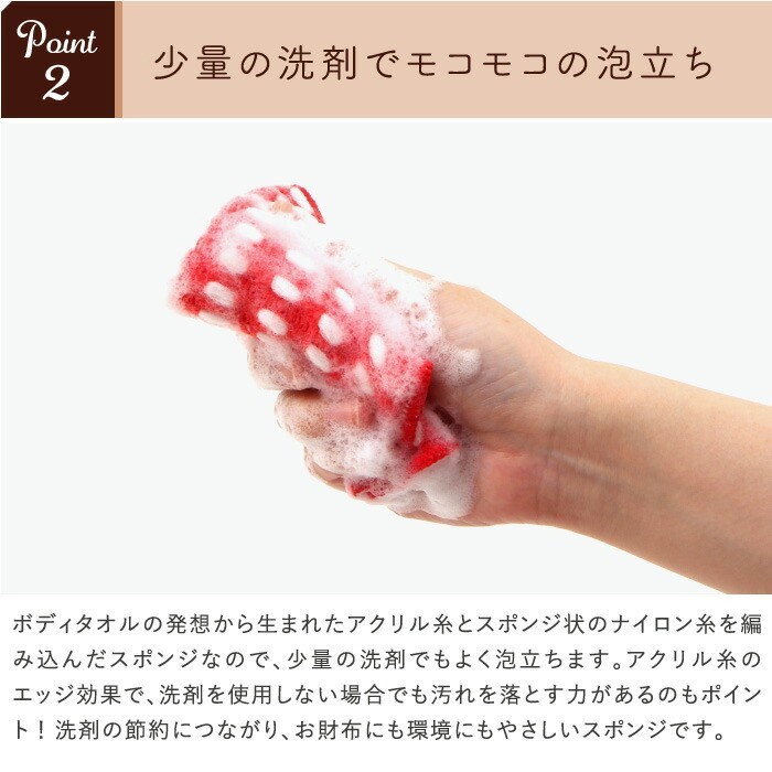 只需少量的洗劑,即可產生蓬鬆綿密細緻的泡沫,此款布海綿的設計靈感來自浴巾,採用腈綸/尼龍紗線交織而成,即使少量洗劑也能有豐富泡沫。腈綸紗線的邊緣紋理,更可有效去除污垢。