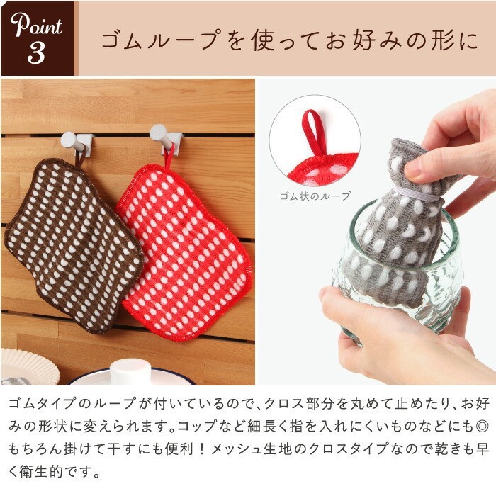 由於是布質的,可以貼合餐具的形狀,並以指尖清潔最細微的角落,易於施力的特性,因此頑固污垢也能輕鬆帶走。