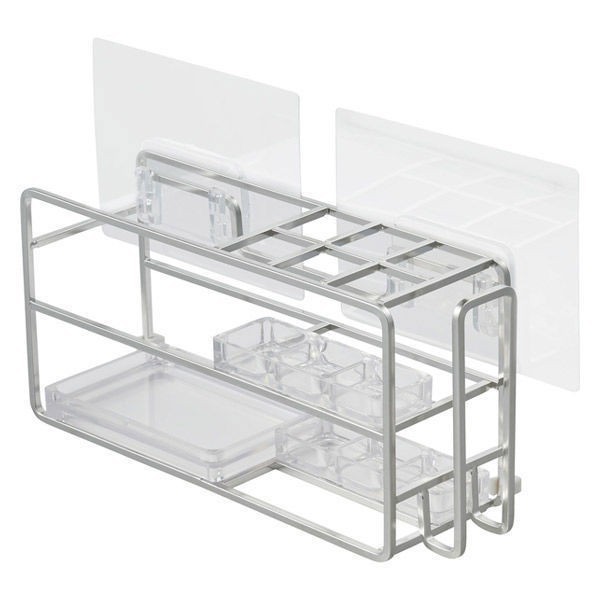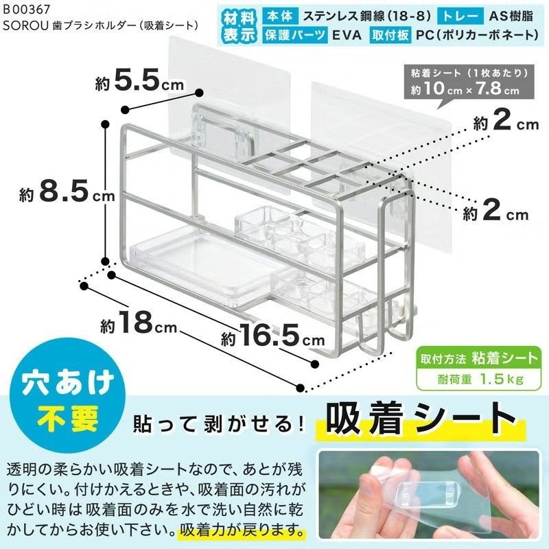 無需鑽孔,附有可重複使用的透明黏膠貼片,可貼在鏡子或其他表面上,節省浴室檯面空間。