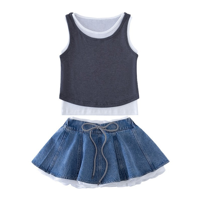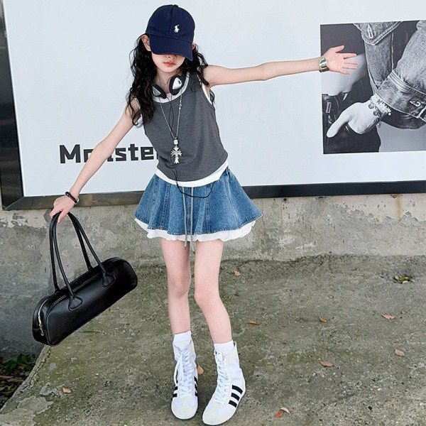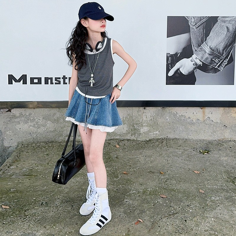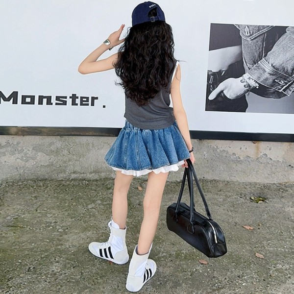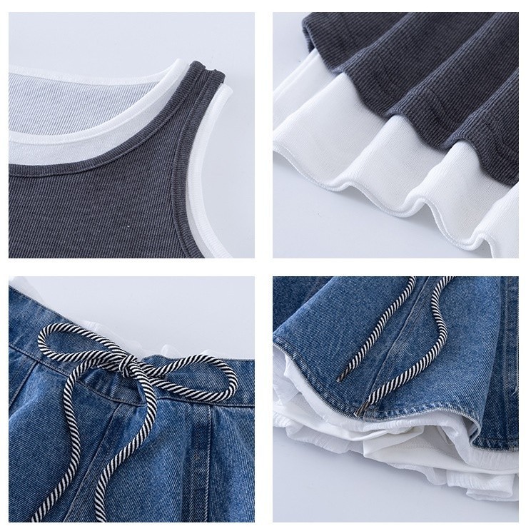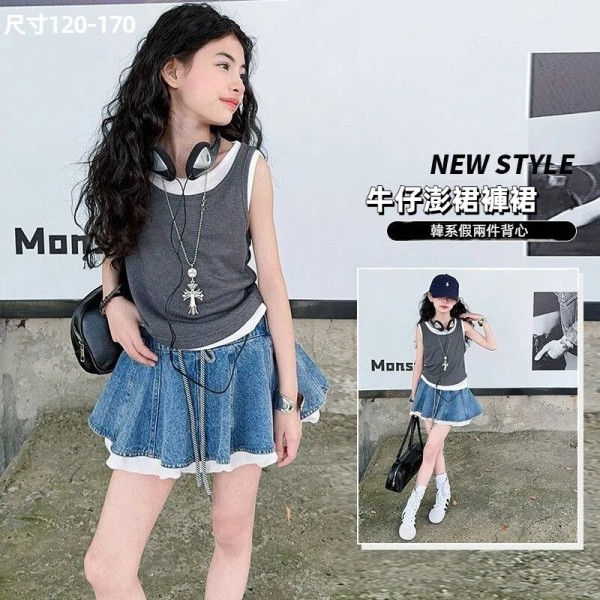 DJU068中大童假兩件背心&牛仔澎裙褲裙