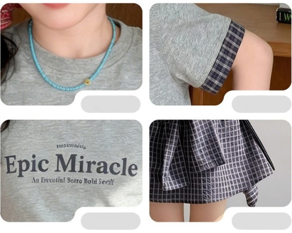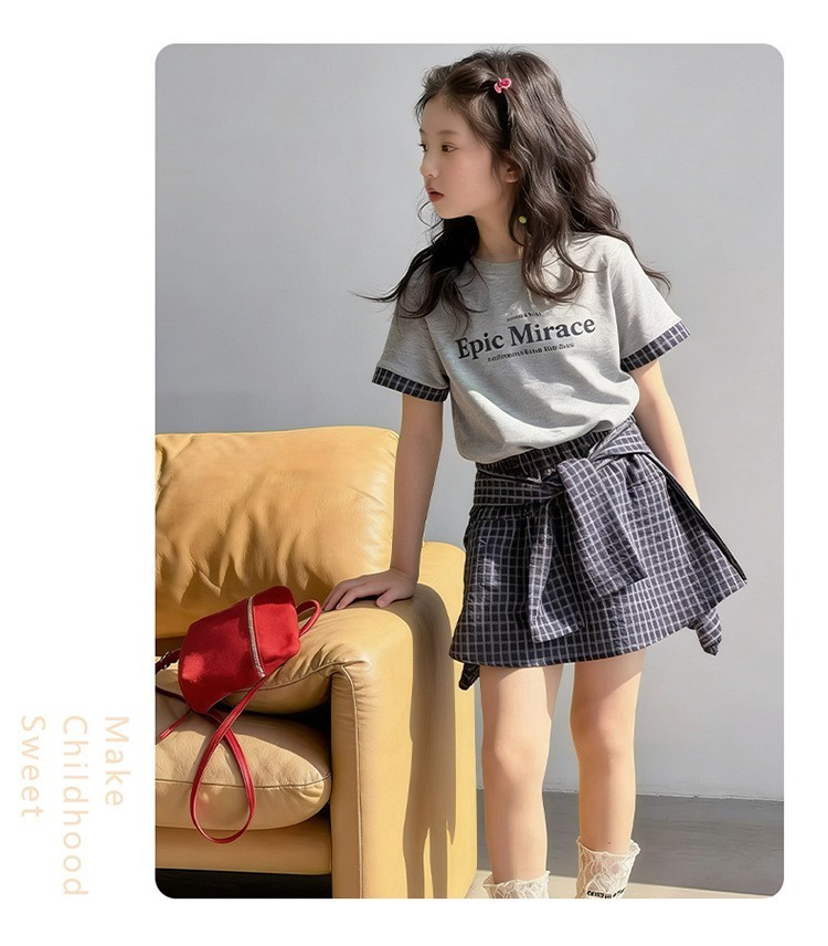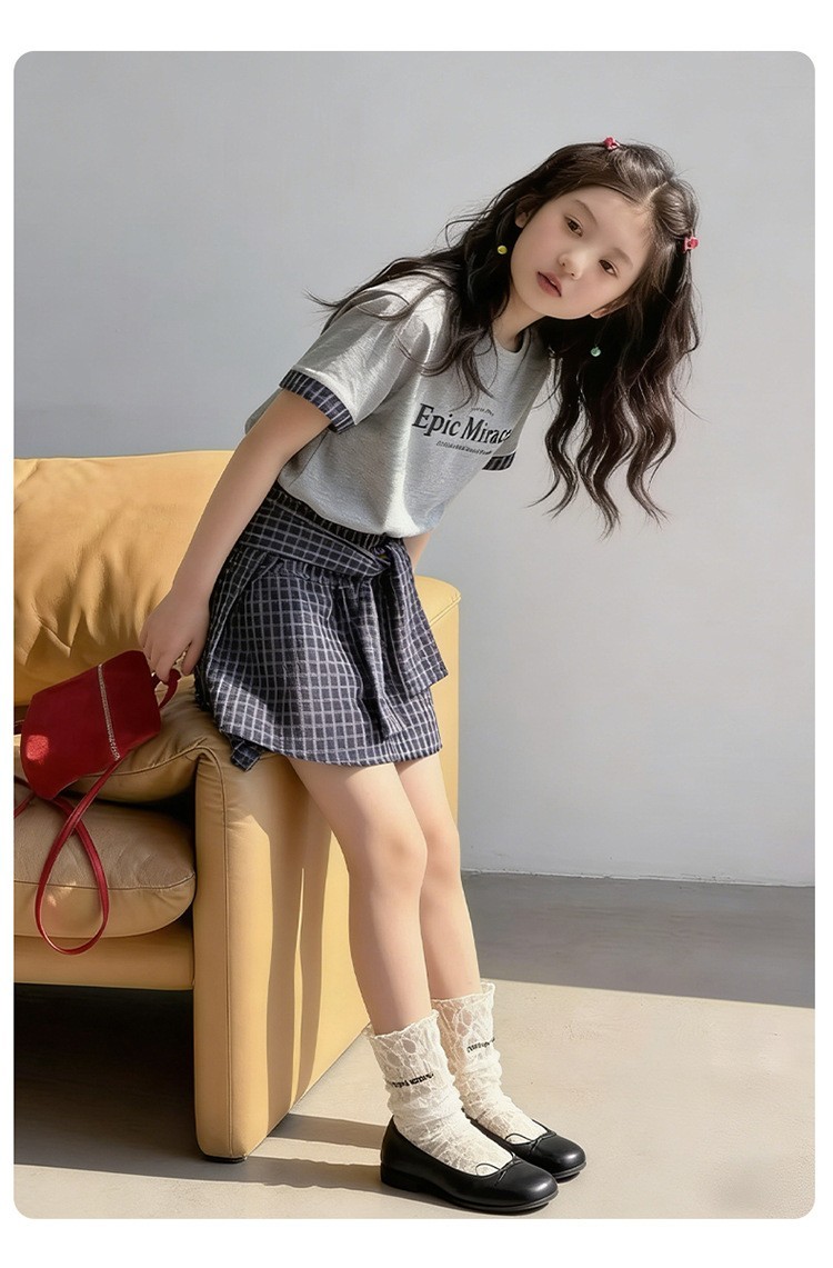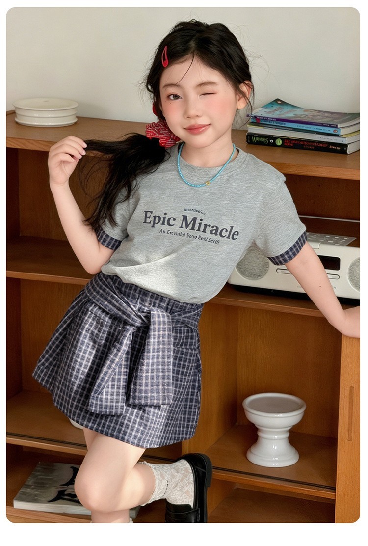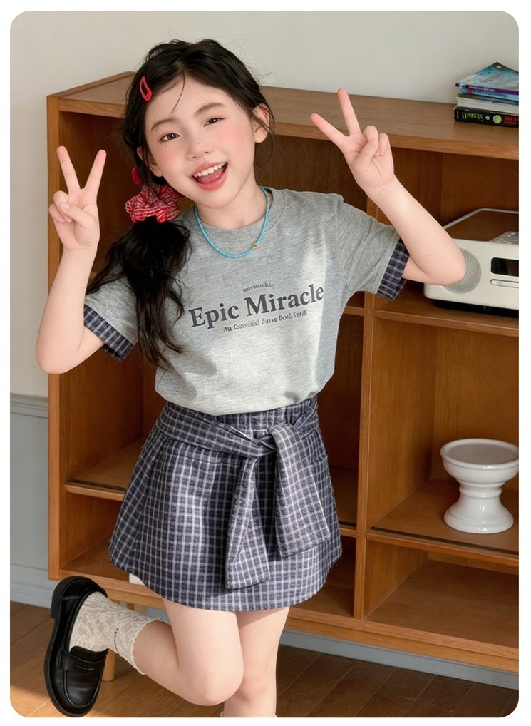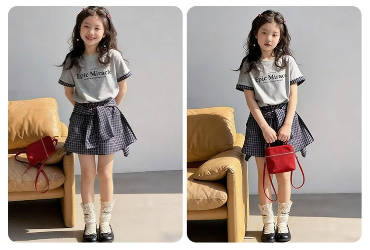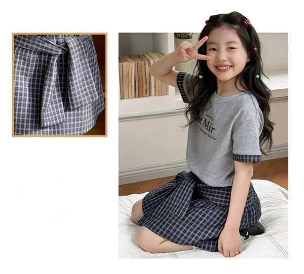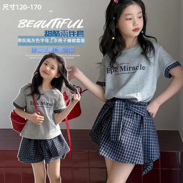 DJU2350中大童學院風灰色字母上衣格子褲裙套裝