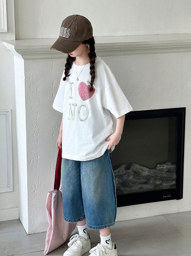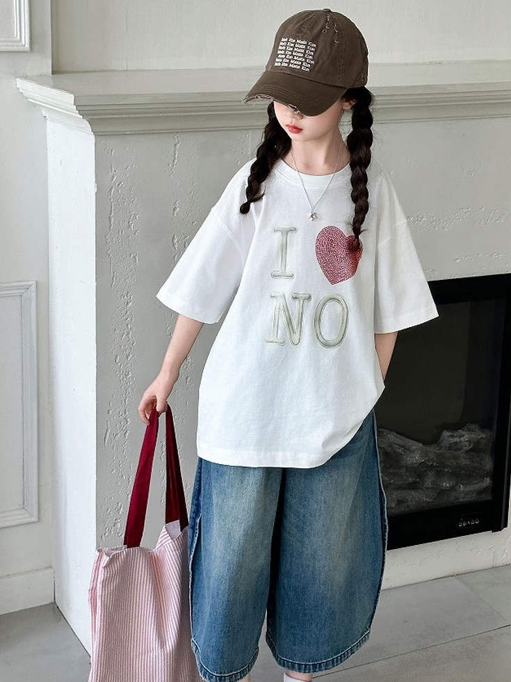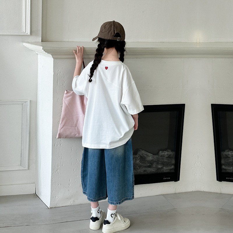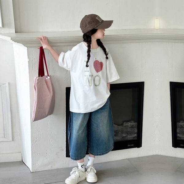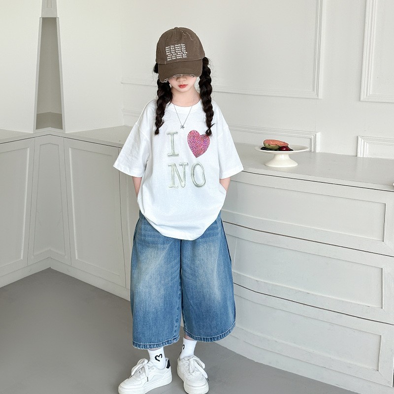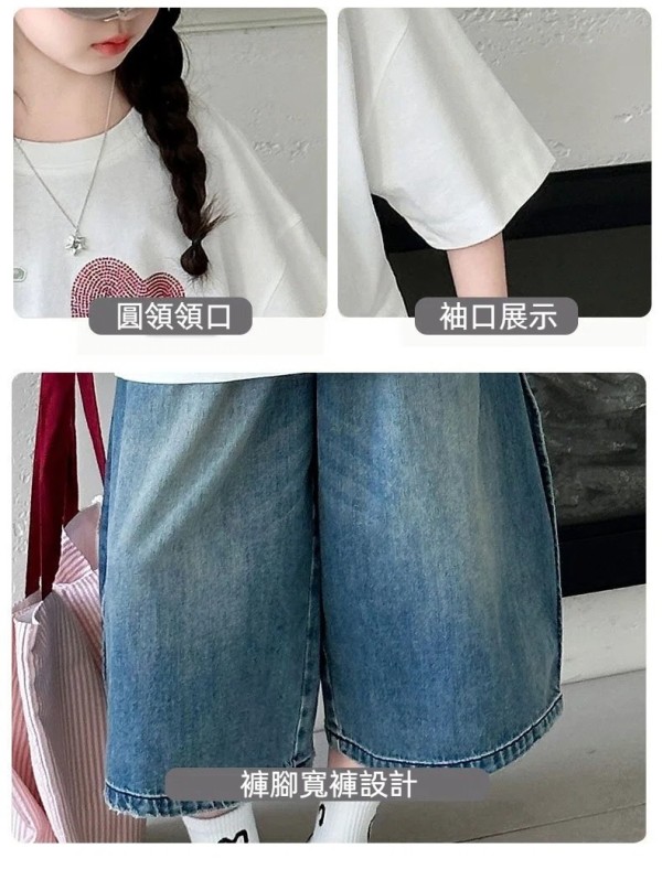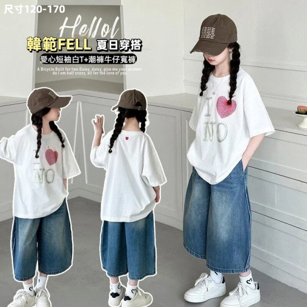 DJU9097中大童愛心短袖白T+潮款牛仔寬褲