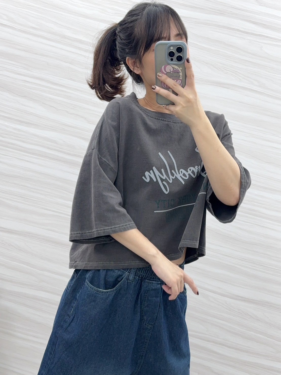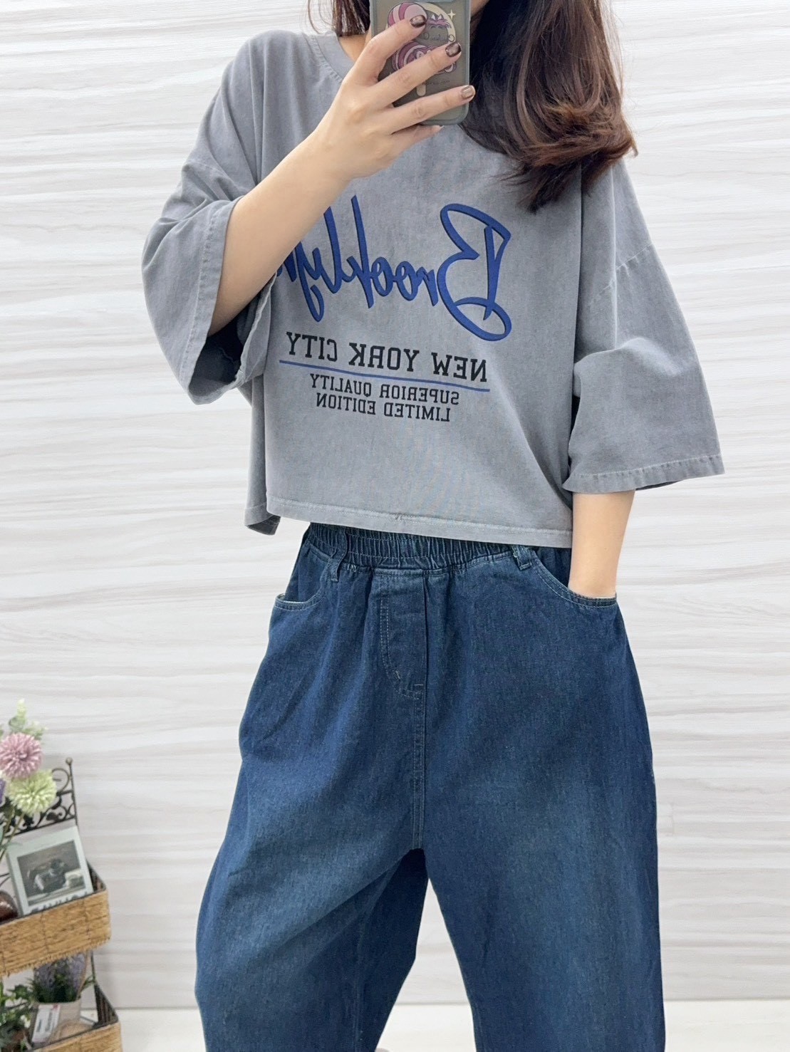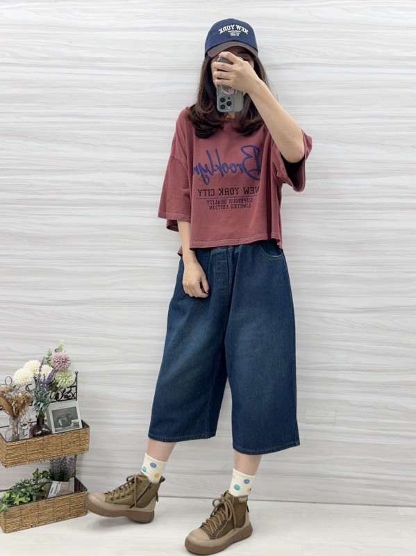短版上衣衣長有50公分,搭配模豆穿的六分牛仔寬褲,根本就是一套的