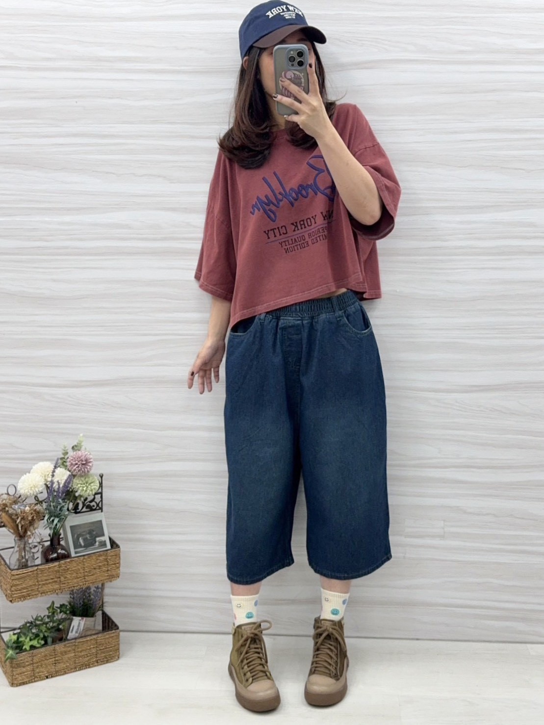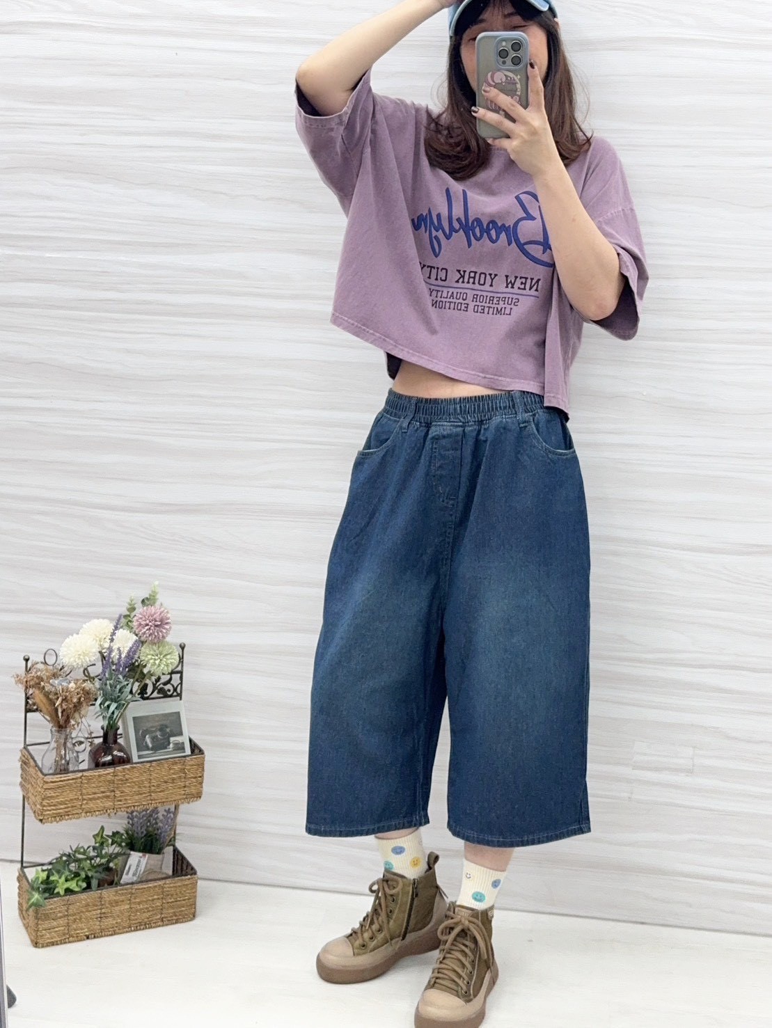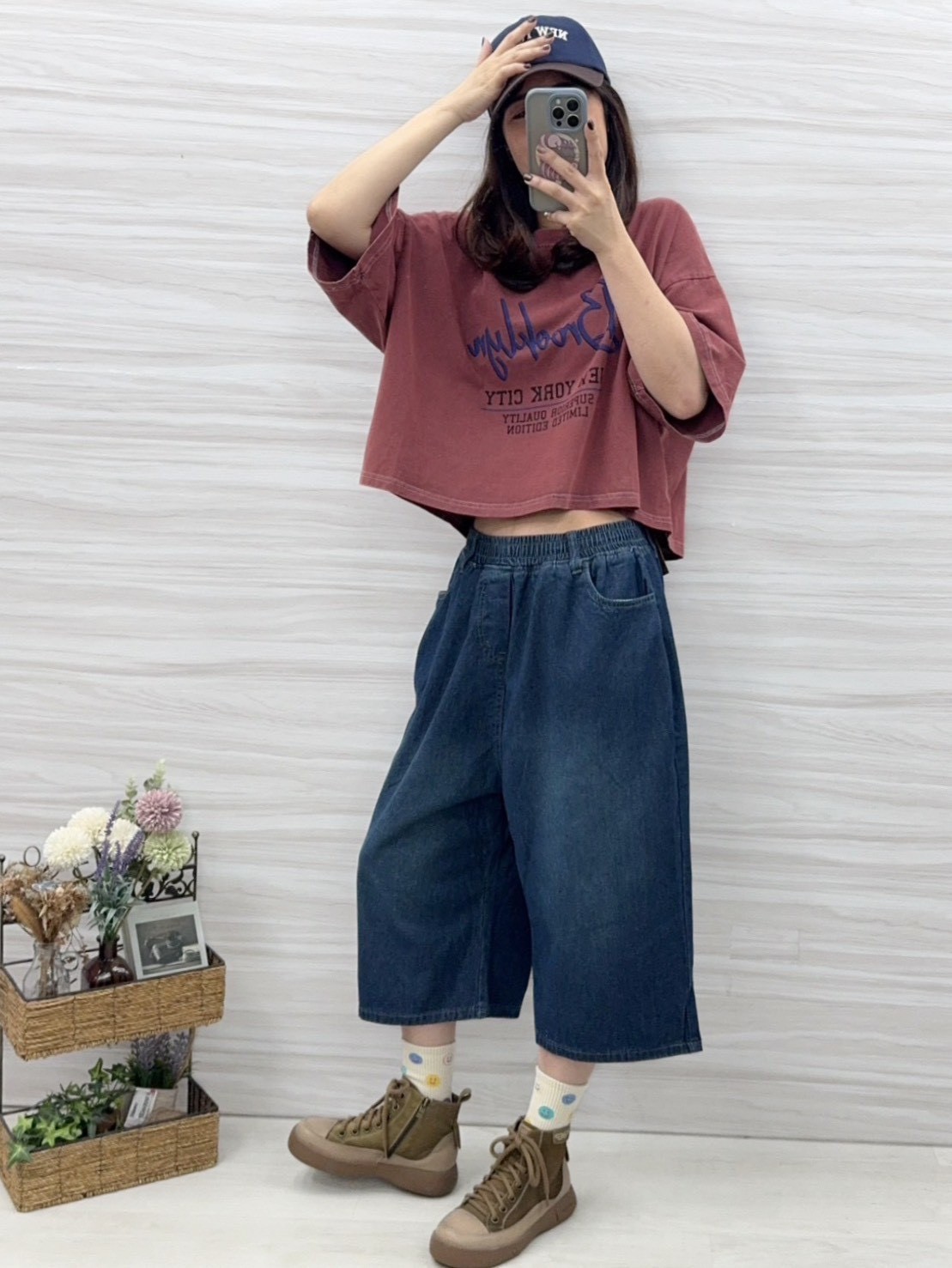 短版上衣衣長有50公分,搭配模豆穿的六分牛仔寬褲,根本就是一套的