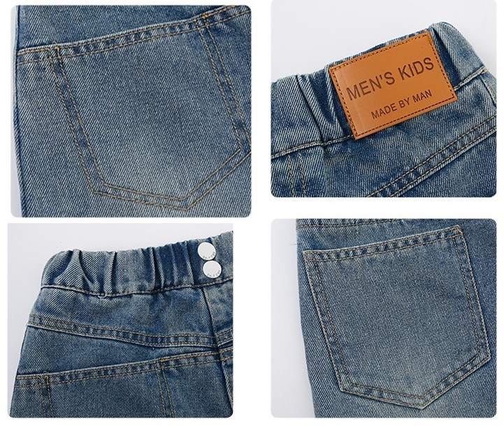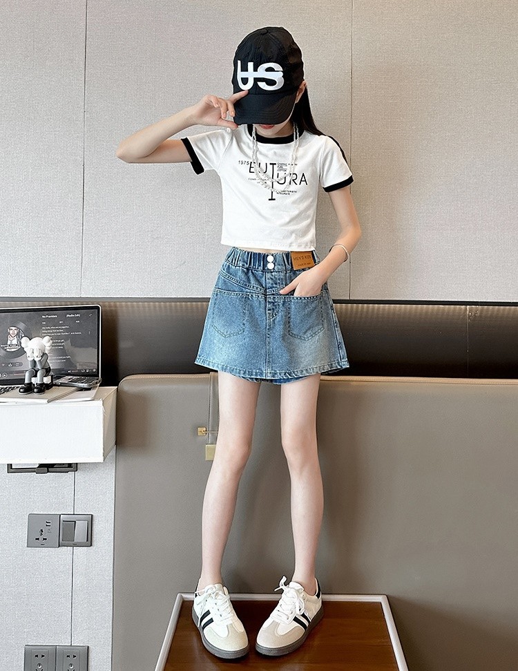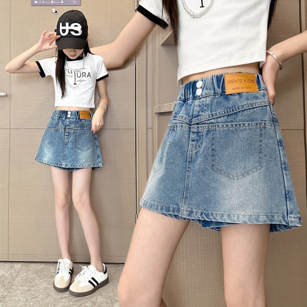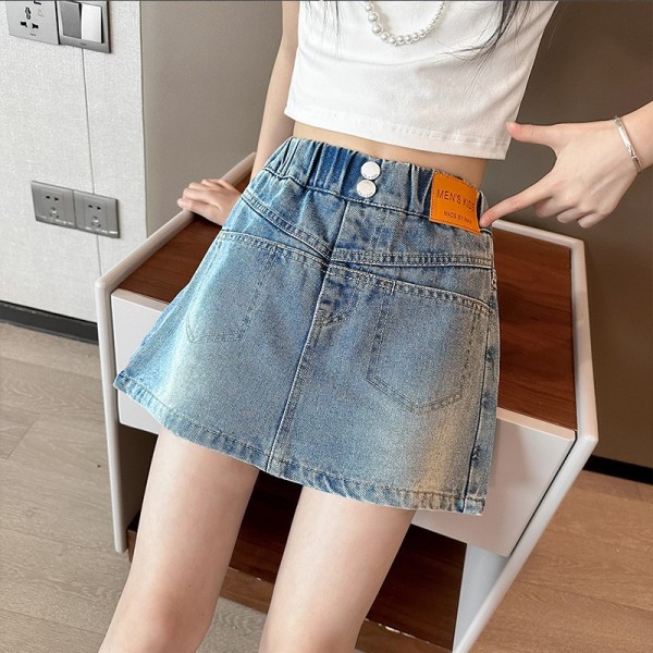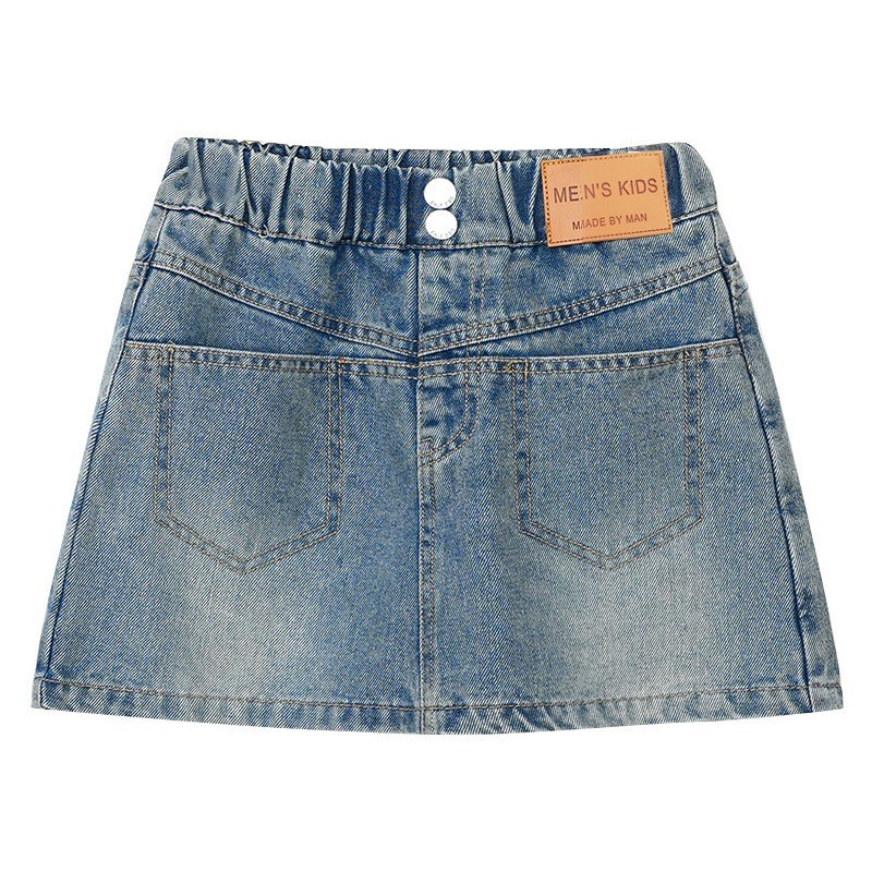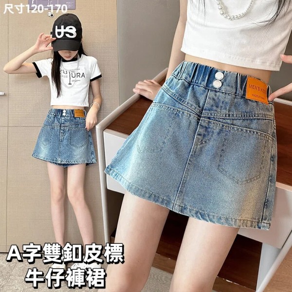 DJU2452中大童A字雙釦皮標牛仔褲裙